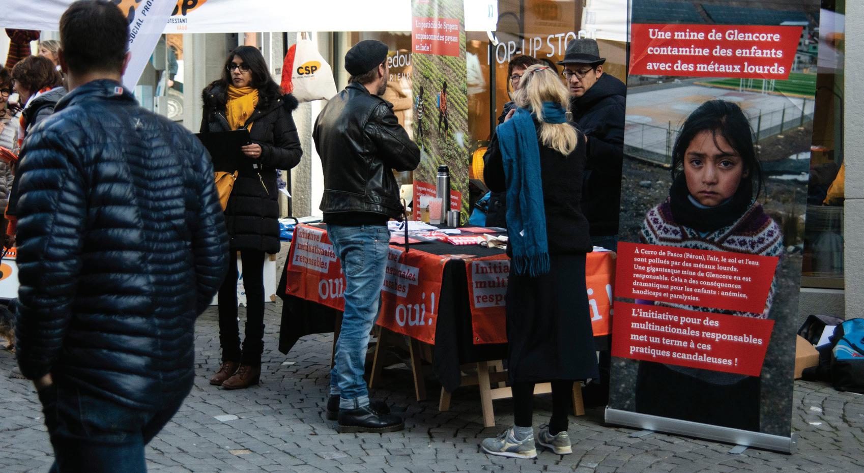 La seconde initiative s’attaque aux multinationales suisses peu scrupuleuses des droits humains et de la protection de l’environnement dans leurs activités commerciales. De nombreuses études de terrain ont révélé des pratiques honteuses dans des régions du monde souvent hors radar, au nom de profits économiques. Une enquête de Public Eye met en lumière la vente dans le district de Yavatmal en Inde d’un pesticide produit par Syngenta, alors interdit en Suisse et dans l’Union européenne depuis 2009. En 2017, des centaines de cultivateur·trices ont subi une intoxication, voire un empoisonnement, dont les effets sont des pertes temporaires de la vue, et des problèmes de santé persistants, notamment d’ordre neurologique et musculaire. Ou encore en avril 2018, dans la région d’Espina au Pérou où Glencore désire agrandir l’espace de prospection de sa mine, et met ainsi tout en œuvre pour se débarrasser des communautés autochtones vivant sur place. S’appuyant sur un État qui ferme les yeux et des droits fonciers lacunaires, des employé·es et du personnel de sécurité privé de Glencore ont menacé et attaqué les habitant·es.