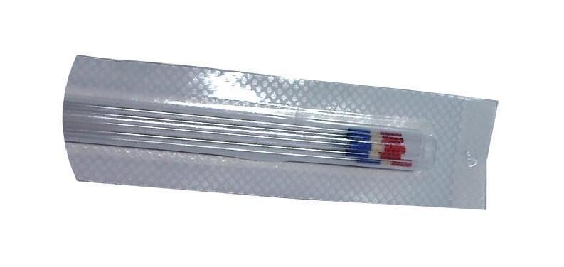 Sterilized 1⁄4 cc PVC straw, 5.25” long. Unique red, white and blue with wick and powder plug.
