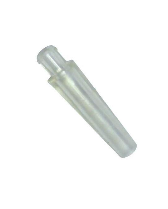 One end fits into a luer slip syringe and the other tapered end is inserted into catheter tubing.