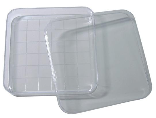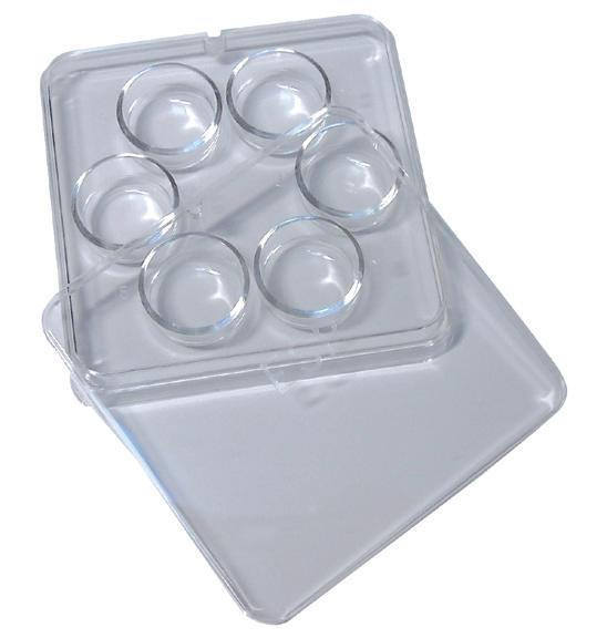 A 3” x 3” square dish with six deep round wells, each 0.75” in diameter.