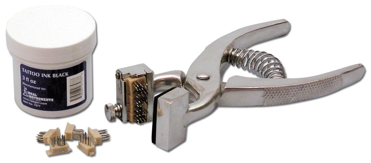 Ideal Tattoo Markers are versatile, economical instruments with heavy-duty construction used for permanent animal identification. The large pliers hold four 3⁄8" letters or digits. The small pliers hold five digits. Aluminum alloy pliers.