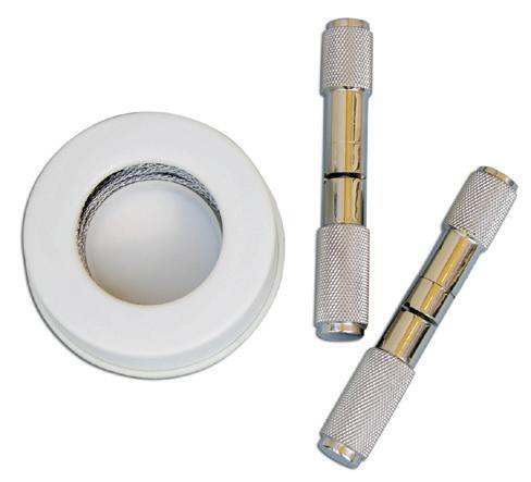 The 27-strand stainless steel wire saw provides easy and quick cutting. The 32' coil is packaged in a reusable plastic dispenser to prevent tangling. Handles come as a pair and are nickel-plated for easy clean-up. Thumb screws lock the wire in place.