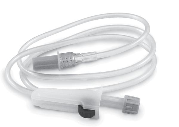 Universal kink resistant tubing with smooth action roller clamp, Y injection site and detachable needle, available in 10, 15, 20 and 60 drop per mL sizes. Compatible with both bottles and bags. Non-Sterile.