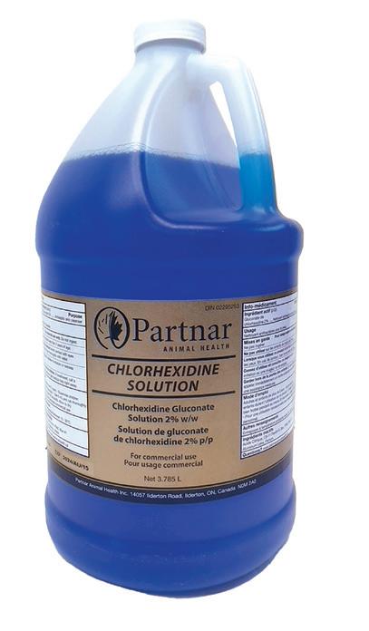 A topical aqueous solution containing 2% chlorhexidine gluconate. For use on non-food producing animals for application to superficial cuts, abrasions or inset stings. Chlorhexidine Solution leaves a residue on the skin which gives a persistent antibacterial effect lasting 1 or 2 days. Its actions are not affected by blood, pus or soap. PCH-020 3.78 L (sold in a case of 4) ................. $54.15