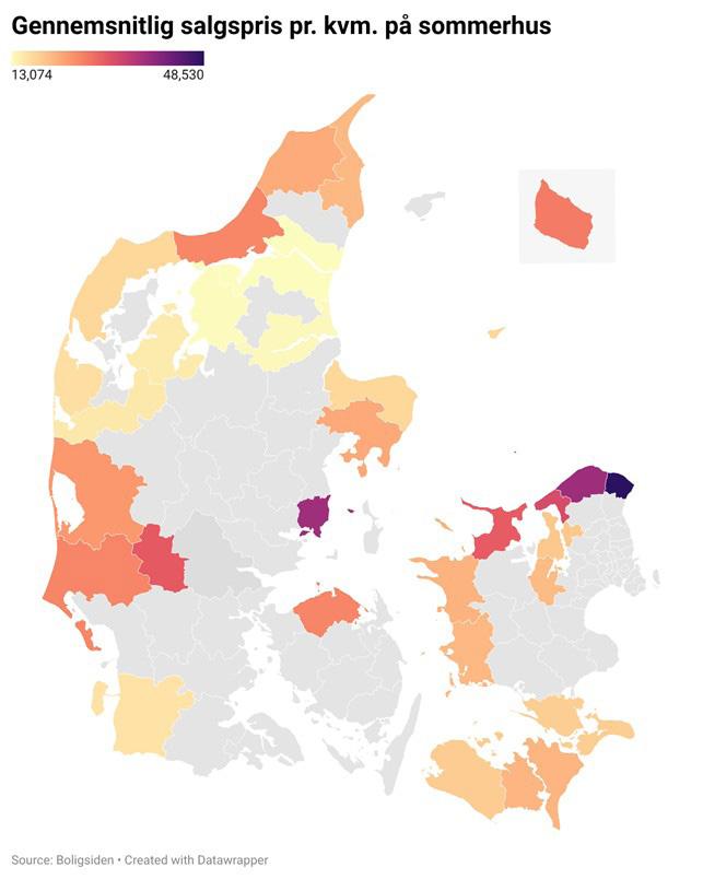 Sommerhusmarkedet har været igennem en vild udvikling siden corona, hvor mange for alvor fik øjnene op for, hvor skønt det er at kunne holde ferie i Danmark. Det fik ikke bare efterspørgslen men også priserne til at stige. I februar i år lå kvadratmeterprisen på 24.744 kroner for et gennemsnitligt sommerhus. For et sommerhus på 75 kvadratmeter svarer det til en pris på knap 1,9 millioner kroner. Men i nogle kommuner er gennemsnitsprisen det halve og i andre næsten det dobbelte.