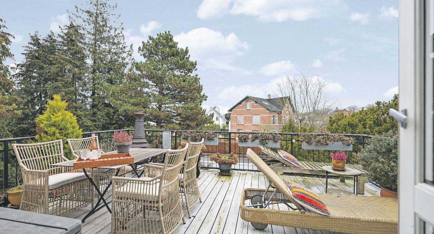 Villalejlighed med stor terrasse og udsigt over områdets trætoppe og hustage
