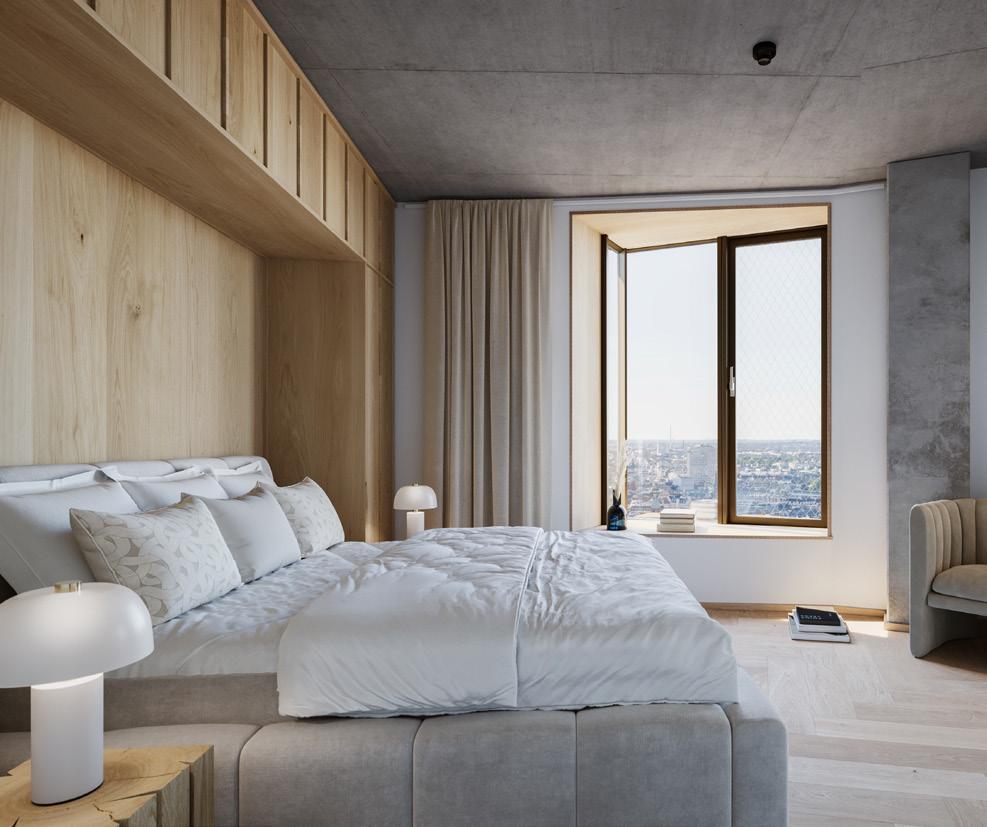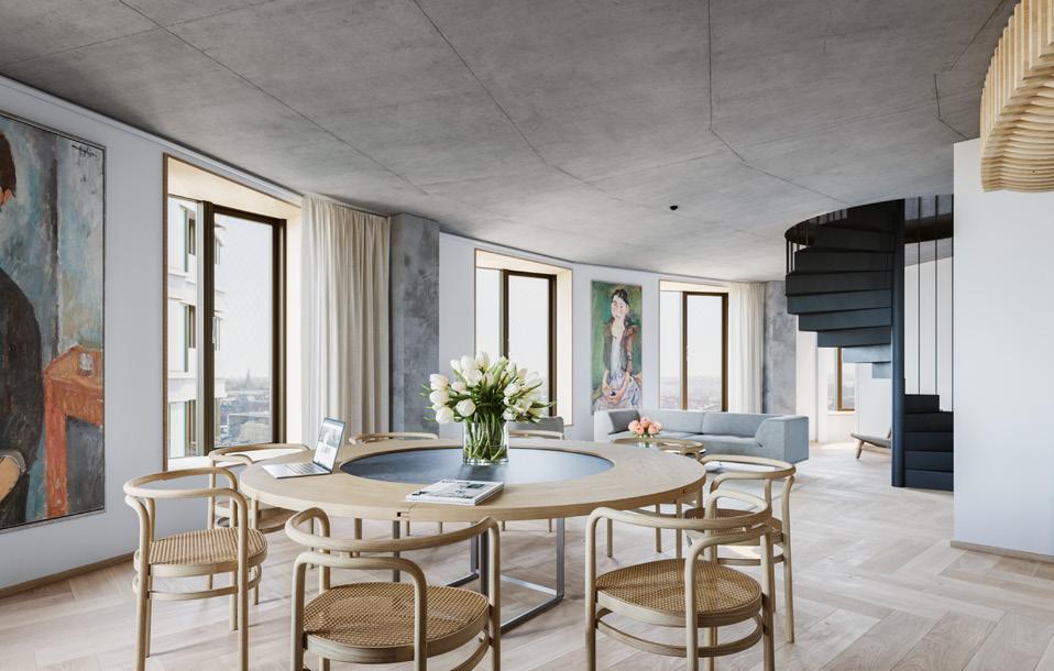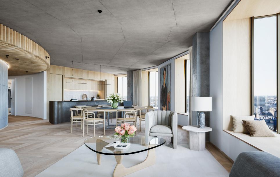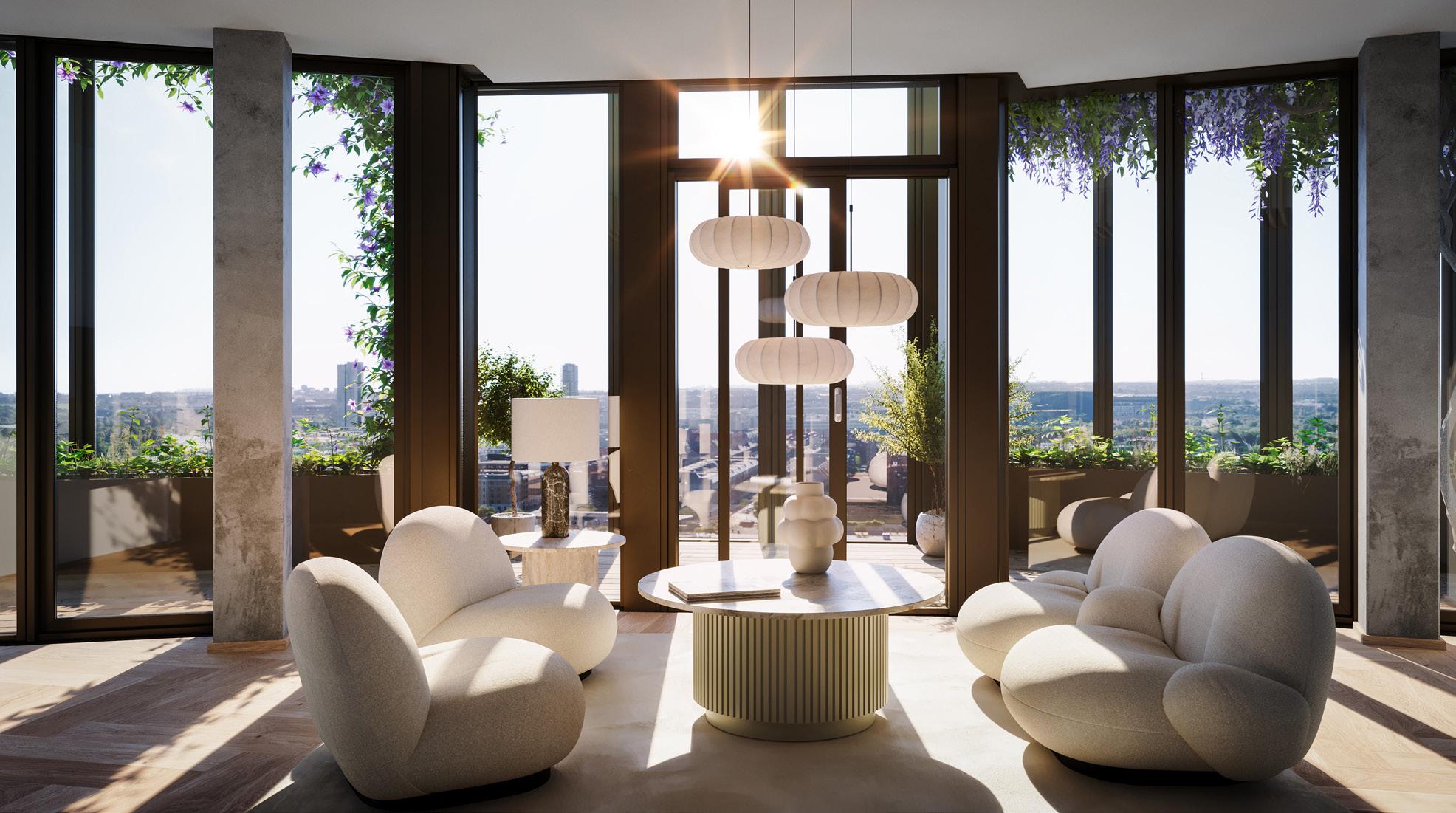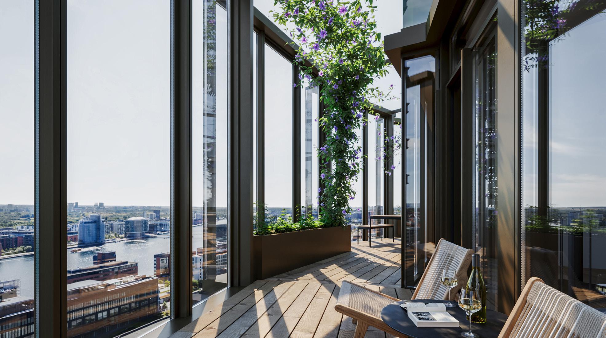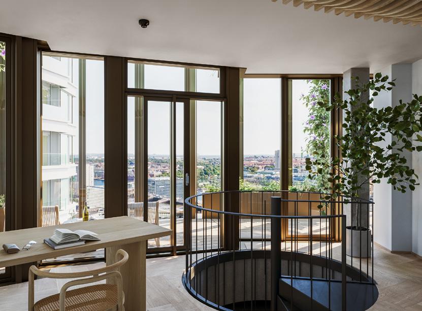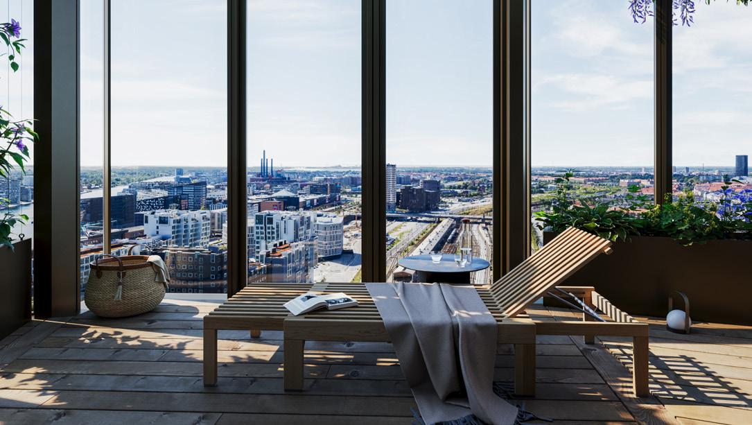 Ejendommen Postbyen 8 har 2 duplex penthouselejligheder, som ligger forskudt af hinanden, så de hver deler etagerne på 22. og 23. sal med en næsten 360 graders udsigt over byen. Et arkitektonisk greb, som giver de 2 lejligheder de vildeste udsigter over København, Nordkysten, Skåne og Øresund og videre ned mod det sydlige Sjælland.