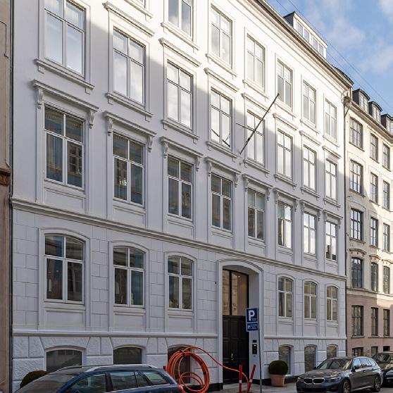 Bibliotek / kontor med den smukkeste indbyggede reol og ikke mindst opholdsstuen med det flotteste kig ad Holbergsgade og solnedgang over Christianborg. Her er egetræ, messing, ølandssten og stukkaturkunst. Overlegent og overlækkert. I midten af ejendommen gemmer sig et gårdmiljø, der er så veludført, at Københavns Kommune har præmieret det.