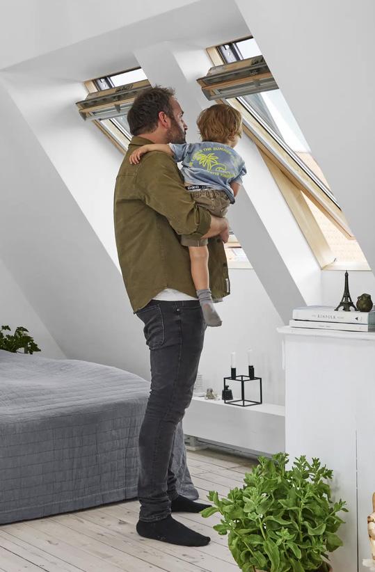 når man bor i lejlighed, men det kunne vi her med vinduerne, og så var det bare målet at få så mange som muligt,” siger Line Resultatet blev 17 ovenlysvinduer fra VELUX, placeret strategisk for at skabe et jævnt og behageligt lys i rummene dagen igennem. Da håndværkerne begyndte at skære huller i taget, og Line og Marko for første gang fik mulighed for at kigge op på loftet, gjorde oplevelsen stort indtryk.