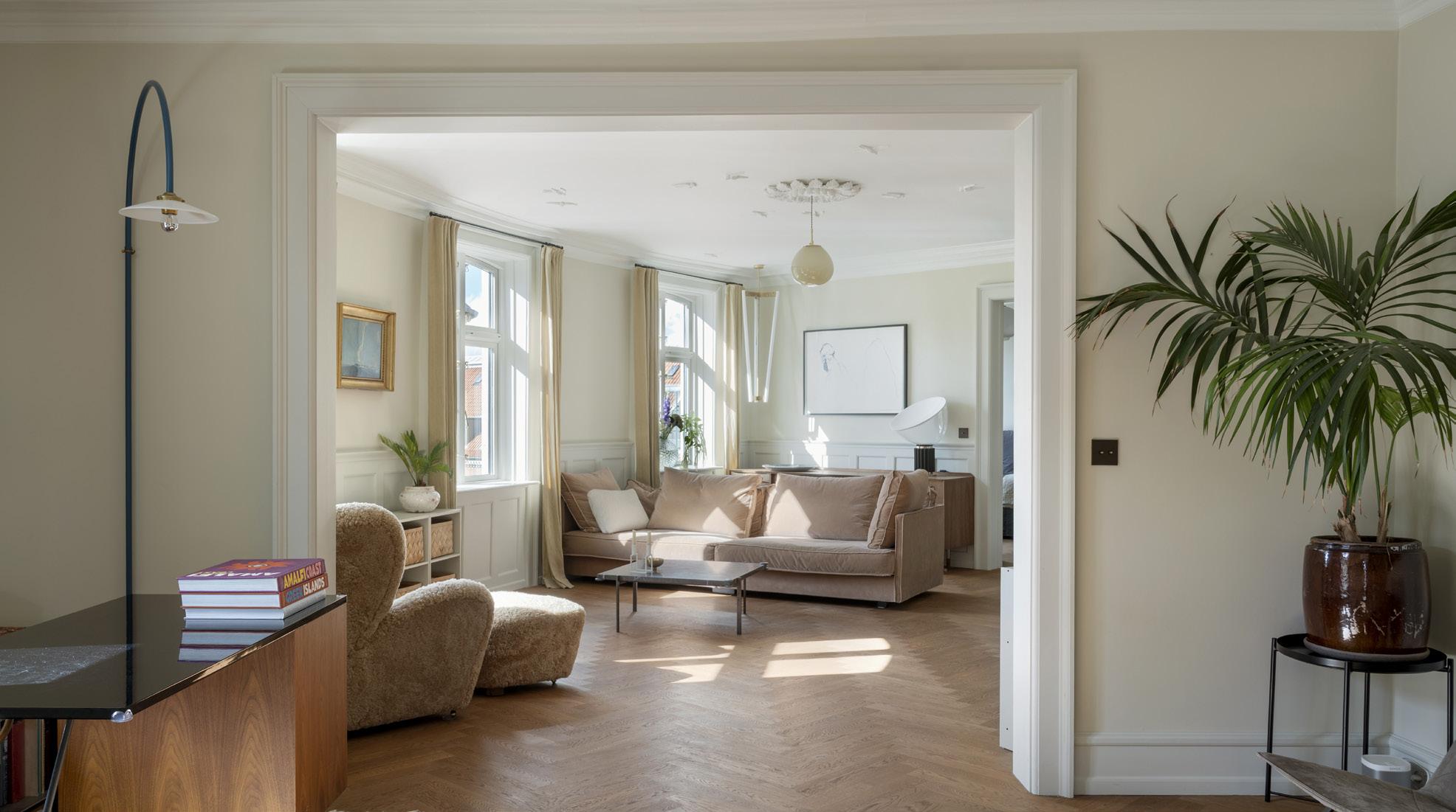 En dygtig arkitekt har givet lejligheden en ny grundplan og nerve – med køkkenet fra Københavns Møbelsnedkeri som centrum med plads til de mange. Herfra, dobbeltdøre ud til stor og solrig altan.