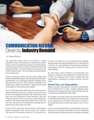 COMMUNICATION REFORM Driven by Industry Demand By / Stephane McShane The construction market seems to be evolving at a speed unmatched in history. The demands for collaboration, problem solving, and rock solid planning processes are driving changes in communication means. It is critical to address the cultural and operational hurdles – created by ineffective communication and conflict resolution skills – that can hinder the forward progress of your organization. Today’s construction industry and the clearly defined path forward include pull planning, multi-trade design and fabrication, modularization, and increasingly accelerated schedules. All of these items have one core value in common: collaboration. To accelerate the schedule, the industry is demanding that trades work together to solve problems more rapidly. The era of the dictatorship model where the general contractor openly orchestrates every move is coming to an end in favor of the lean, team-engaged environment. This model thrives where input and active participation are held paramount. That said, it begs the question: How can we deliver a fully collaborative product to our external clients (those outside of our walls) if we don’t have that same level of collaboration occurring with our internal clients (those inside our walls)? In the world of construction, the lack of clear communication between management, staff, and the field is still common. The reason for its continuance cannot be, “It’s been that way 14 » Partners in Progress » www.pinp.org