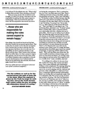 PROBLEM?, continuedfrom page 9 out having the consequences. That's a rationalization, but I don't say Baba approved of that. There's a difference between trying to obey Baba, and disobeying Baba and saying, "That's okay with Baba," or, "To disobey is okay with Baba because what He said is just a goal, but I'm not going to obey Him, I'm going to do this other thing. And I'm not going to say I'm failing. I'm going to say 'this is okay, too!' or, 'Baba approves of this because He loves me.'" That's not right! It's one thing to say, "I'm disobeying Baba, and I don't care." It doesn't please Baba to disobey Him. That's a personal point in your relationship with God-whether you care to please Him... how far you're willing to go to please Him. But often this stuff is the first step in eventually phasing out all of His requirements that we live in a certain way. And before you know it, we're just living like everyone else in the world; and we're doing what everyone else is doing; and we're just as nonchalant as everyone else; and then you look down and there's no more daaman in your hands. There's a few threads under your nails, but the daaman is gone. Baba's gone. It's rough. But these rationalizations about Baba approving of sex outside of marriage, or approving of birth control is absolutely... That's not why Baba came down here. He came to uplift everybody as human beings; and to move us away from our desires, our cravings, away from acting out our lower selves. Not to approve of it on a worldly level." (male. mid-fifties, married) "I'm willing to be celibate for the rest of my life. I really don't know what women want these days. I have a great diffIculty with relationships. Celibacy is less complicated. The marriage thing has been burnt out of me. You'd better do what Baba says to do, or you're playing with fire. And you will get burnt, either with AIDS, or a child out of wedlock, or amazingly difficult personal relationships. Baba's not fooling; He's not somebody to play with or to rationalize with. We've had our day of asserting ourselves, of saying, "Oh, that's for Easterners to live up to; us Westerners can't do it." Like it or not, one way or another, you're going to be forced to deal with it. Baba says sex is a "given" in duality, one of the things in life that has to be dealt with." (male, mid-forties, single parent in custody hanleY