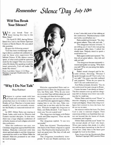 ill you break Your silence during this trip to the West, Baba? On April 25 1952, during Meher Baba's first visit to the Meher Spiritual Center at Myrtle Beach, He was asked this question. He gave the following answer: "God has been everlastingly working in silence, unobserved, unheard, except by those who experience His Infinite Silence. If My silence cannot speak, of what avail would be speeches made by the tongue? The very moment when He thinks My speaking would be heard universally, God will make Me break My silence." From Lord MeIJer Volume 11/12, Bhau Kalchuri, Copyright Manifestation Inc. and AMBPPCT.