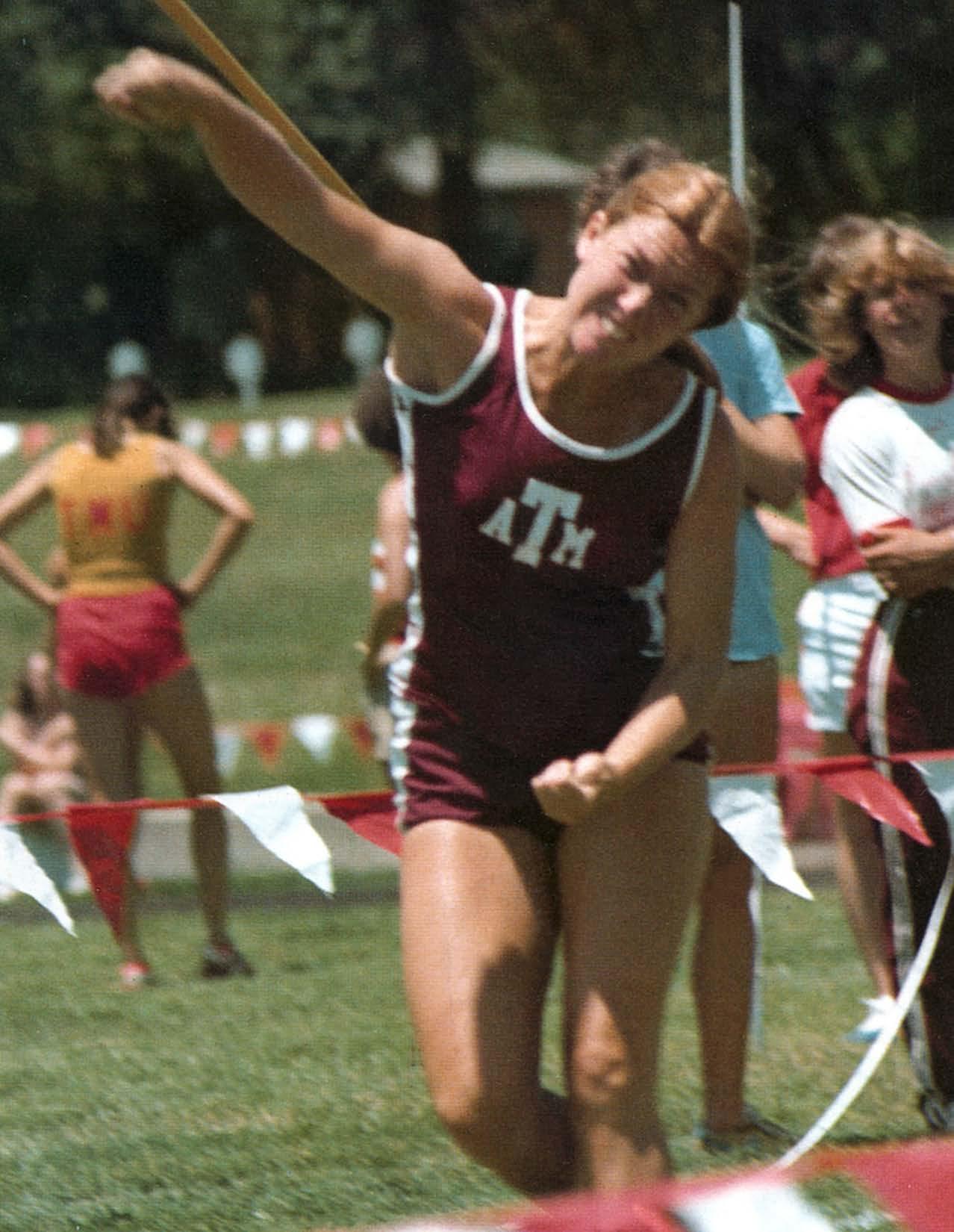 After San Jac, she signed on as a Texas Aggie. At A&M, she excelled at both spiking volleyballs and slinging javelins. As a senior she set a school record in the javelin that stood for 12 years. Twice, she competed for the South at the National Sports Festival.