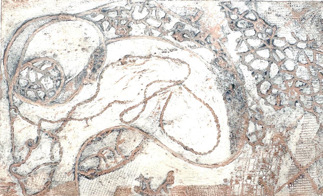 I allow my thoughts to meander wordlessly and to react to the developing image before me. I am not driven to create realistic images, although I do sometimes work with familiar images, combining and arranging them to create a new context.