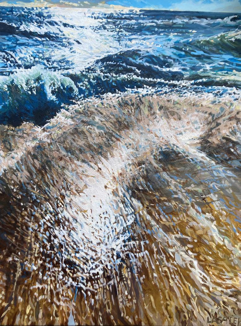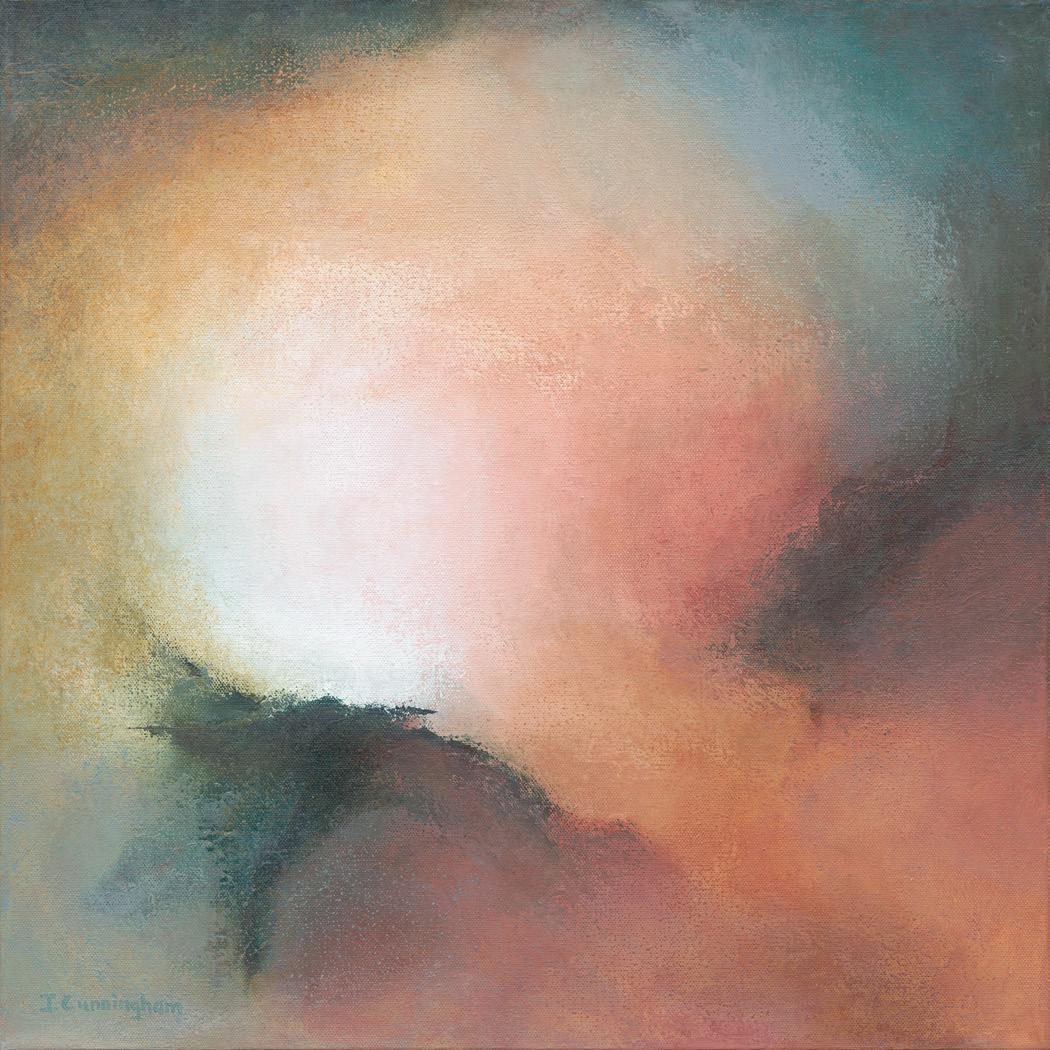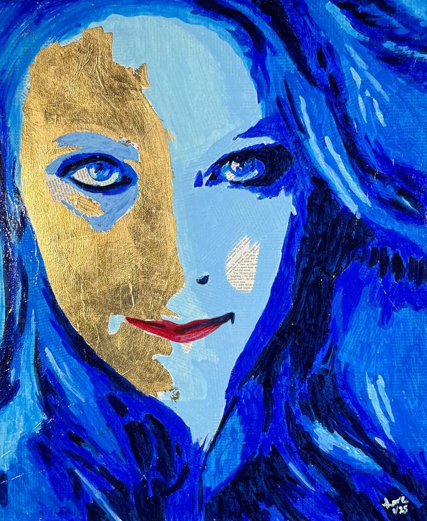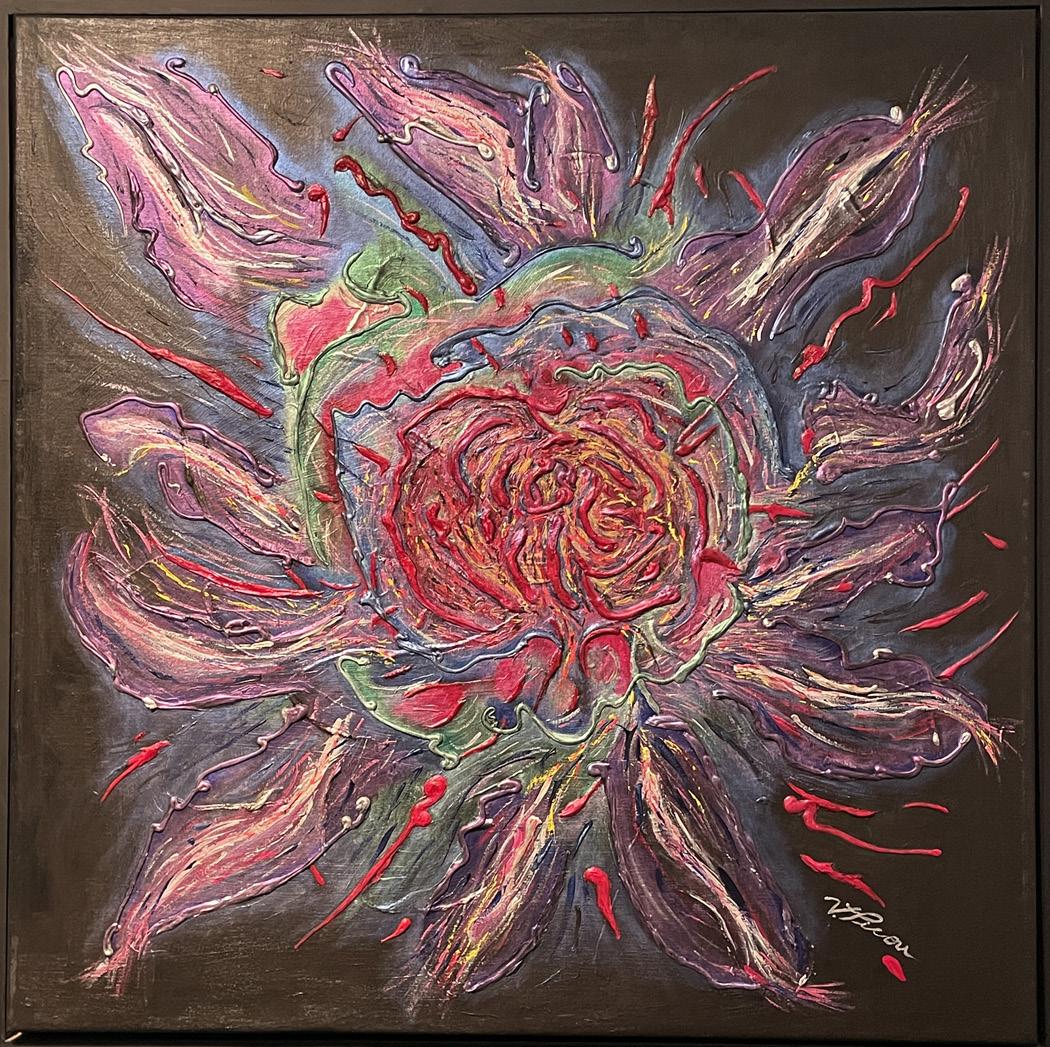 In Heartspace, I followed the pull of something deeper than intention—an unseen current guiding color and form. The work emerged after loss, when words were too small to hold what I felt. The crimson center opens like a wound and a bloom at once, surrounded by the cool strength of blue. It is the moment when grief begins to soften, when love transforms but does not leave. This painting came from somewhere beyond will—an unguarded space where memory, ache, and grace meet.