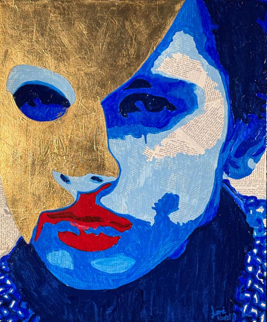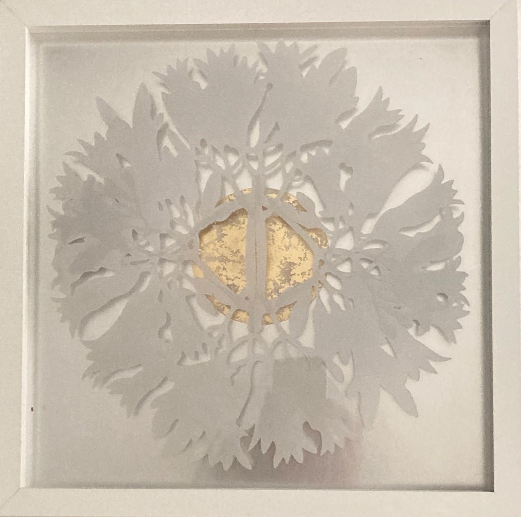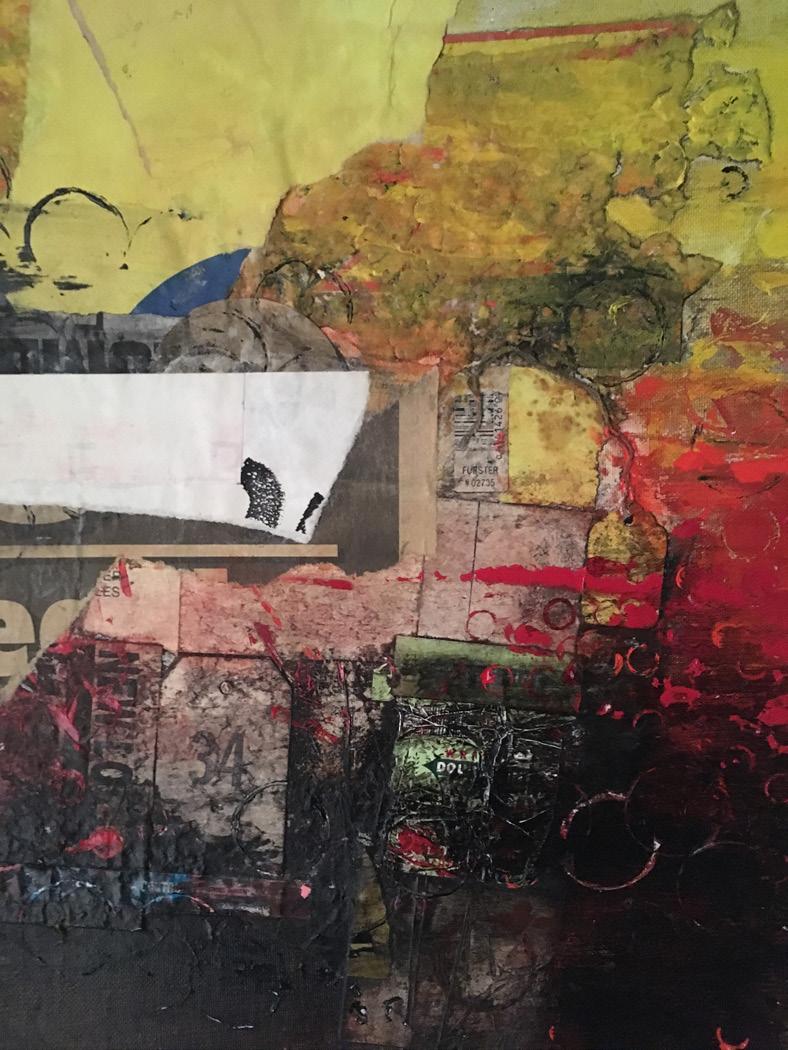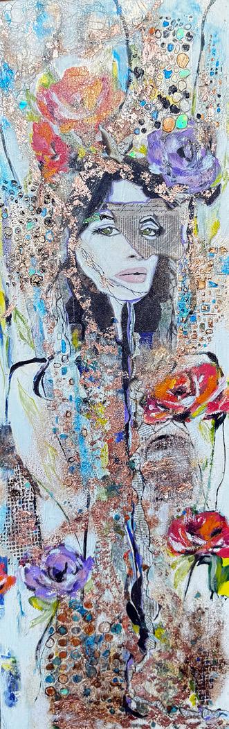 I had an older oil painting of flowers that was never finished. I looked at it and imagined a female figure floating in the background of the flower garden. I sketched and layered in collage, acrylic paint, textiles and mono print papers that I had created... and she slowly came together. The gold and luminescent pops of paper and fabric throughout the artwork reveals her mysterious beauty, as she floats in a dream-like aura of bliss.