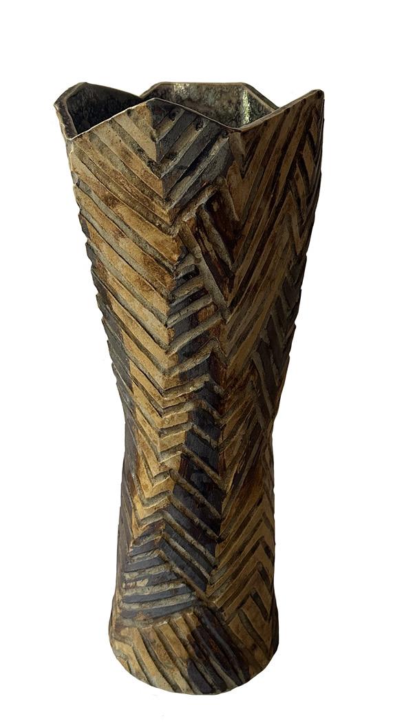 V is for Vivacity. Not for Vendetta. V is for vividness, vitality, verity, victory. This vase has many V’s which, I hope, embody these attributes together with many other vigorous ones. I slab built this vase and etched the V lines and bisque fired. After the application of a glaze inside and oxide outside it was fired to about 2400 degrees.