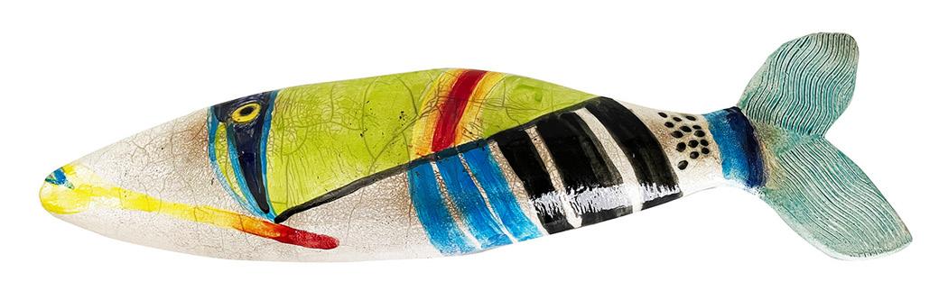This ceramic raku art piece is influenced by tropical oceanic triggerfish found particularly in coral reefs in the Indo-Pacific. The colors I’ve picked reflect the vibrant appearance of triggerfish and the stripes and bold black dots found on forty different species. The stripes on top of the head over the eyes are a hint from the real Picasso triggerfish. By chance, the length of this ceramic fish is the common length of a actual triggerfish.