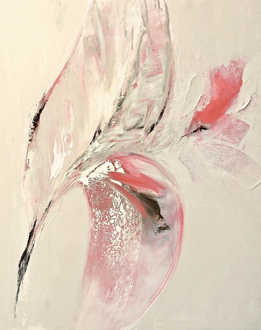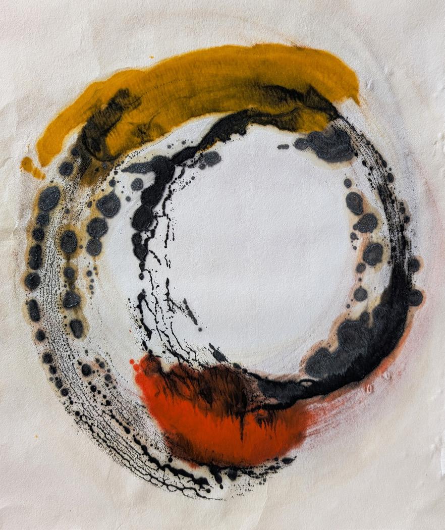 In Heartspace, I followed the pull of something deeper than intention—an unseen current guiding color and form. The work emerged after loss, when words were too small to hold what I felt. The crimson center opens like a wound and a bloom at once, surrounded by the cool strength of blue. It is the moment when grief begins to soften, when love transforms but does not leave. This painting came from somewhere beyond will—an unguarded space where memory, ache, and grace meet.