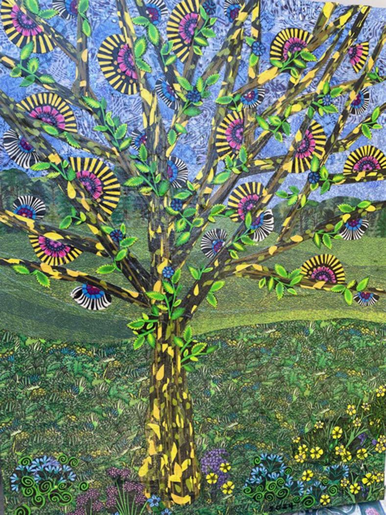 I had an older oil painting of flowers that was never finished. I looked at it and imagined a female figure floating in the background of the flower garden. I sketched and layered in collage, acrylic paint, textiles and mono print papers that I had created... and she slowly came together. The gold and luminescent pops of paper and fabric throughout the artwork reveals her mysterious beauty, as she floats in a dream-like aura of bliss.