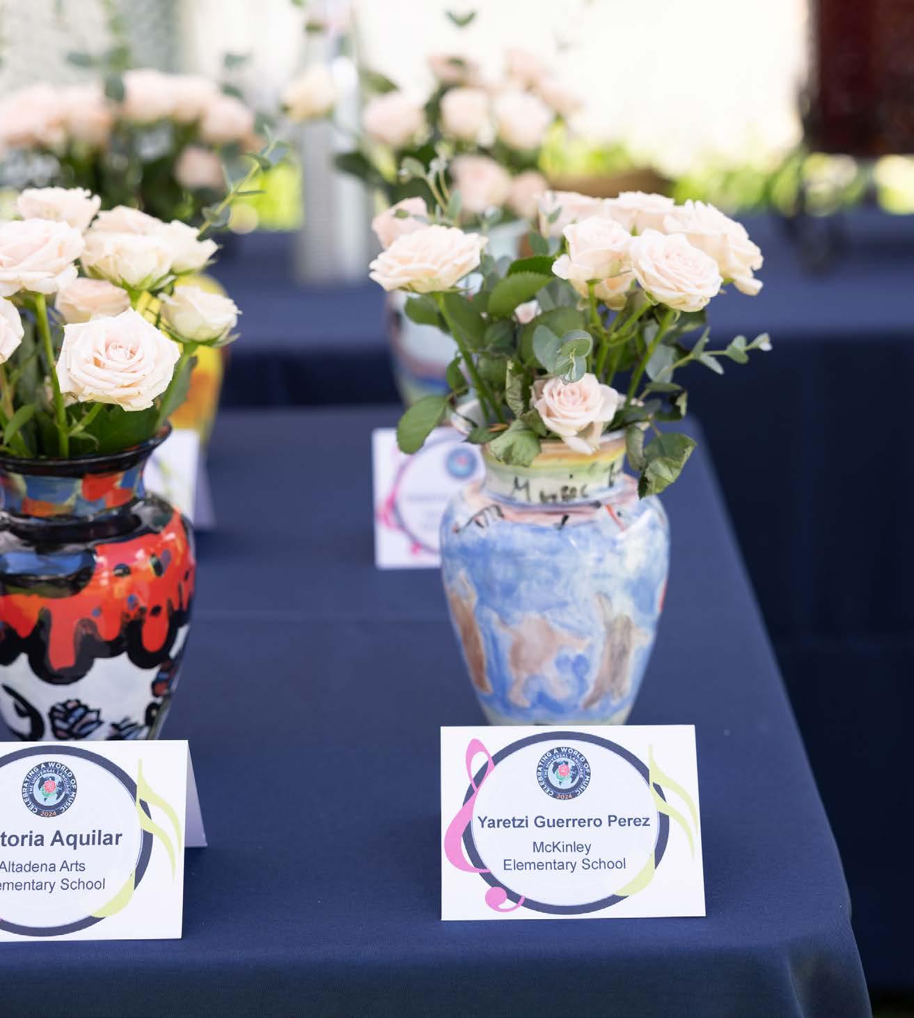 In November, 21 finalists from across PUSD were selected and invited to transfer their drawings to plaster vases using paint and other materials. A special reception was held in honor of the finalists to display their work in front of their families, peers, school district officials and the Rose Court. Awards were presented for first, second, and third place in the elementary and middle school categories from paper to plastic vases and other materials.