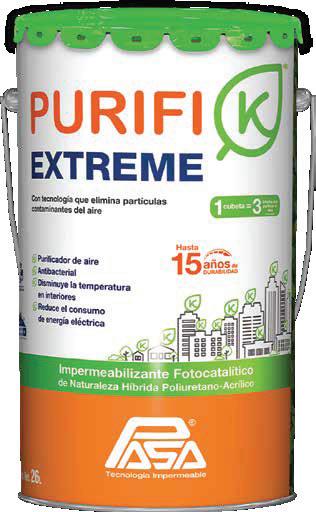 Aplicar una capa de PURIFI-K® EXTREME sin diluir, en toda la super cie con rodillo, cepillo o brocha en una sola dirección. En sistemas sin refuerzo a razón de 0.4 L/m² y en sistemas reforzados a razón de 0.5 L/m² reforzar las áreas críticas como bajadas de agua pluvial, tuberías, coladeras, gárgolas y cha anes con pasa malla plus. Dejar secar entre 12 y 24 horas, dependiendo de las condiciones climáticas.