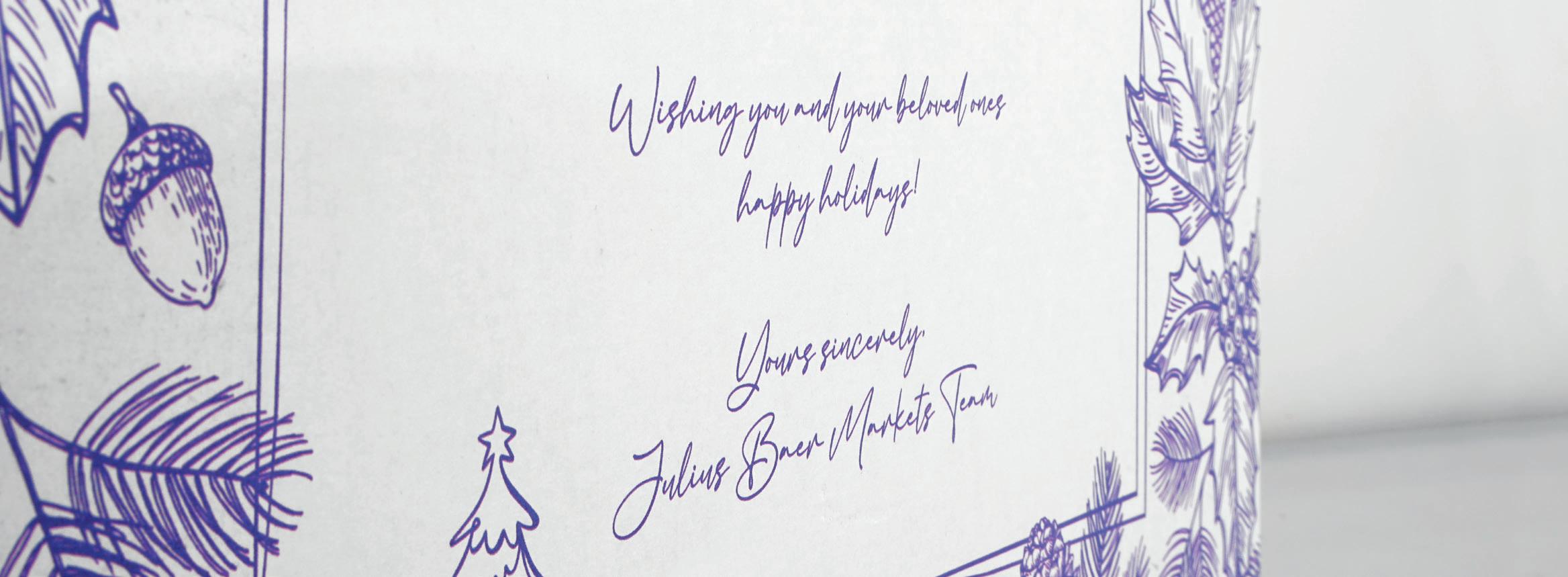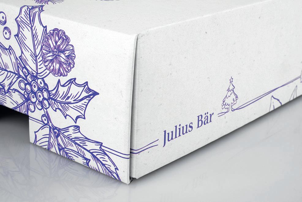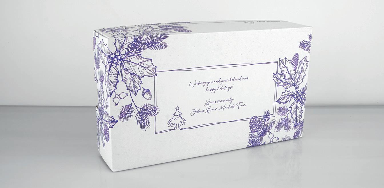 Für Julius Bär durften wir eine massgeschneiderte Geschenkbox mit festlichem Weihnachtssujet realisieren. Der Deckel wurde farblich dem Corporate Design der Bank angepasst, inklusive Logo und Text. Die Box vereint exklusive Genussprodukte mit einer eleganten Präsentation und schafft damit ein stilvolles Geschenk, das Wertschätzung ausdrückt und zur Markenidentität passt.