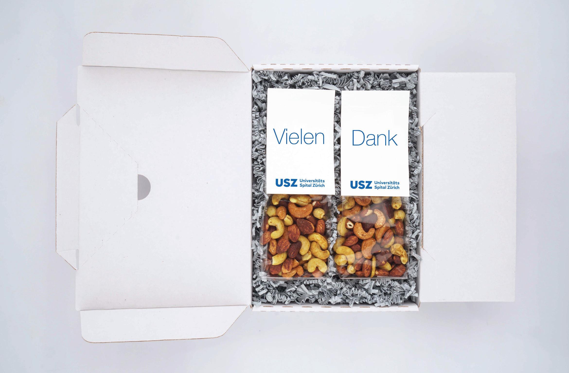 Die Mini-Geschenkbox dient gleichzeitig als Versandbox und enthält zwei hochwertige Packungen Nüsse. Die Etiketten sind individuell bedruckbar und bieten genügend Platz für die eigene Botschaft. Dank verschiedener wählbarer Nusssorten entsteht ein originelles, personalisierbares Geschenk mit hohem Erinnerungswert – ideal für Mailings oder kleine Aufmerksamkeiten zwischendurch.