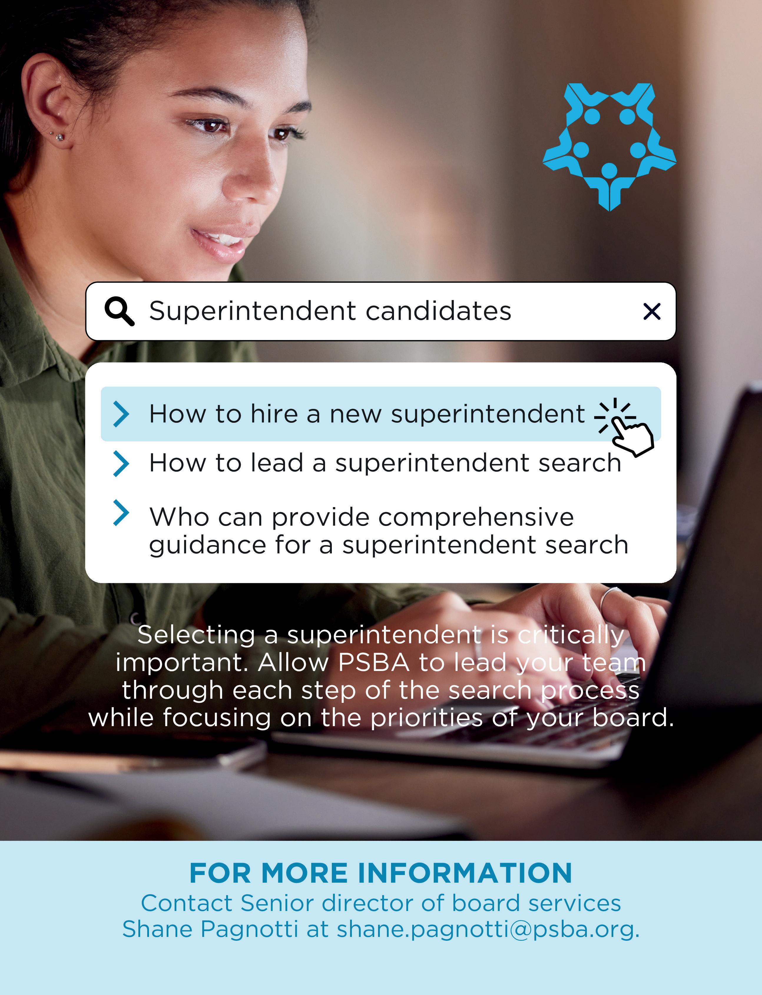 Boards supporting a new superintendent face unique opportunities and challenges. On page 22, see how one board navigated the transition successfully and gain insights from the administrator perspective on what superintendents need most during this time.
