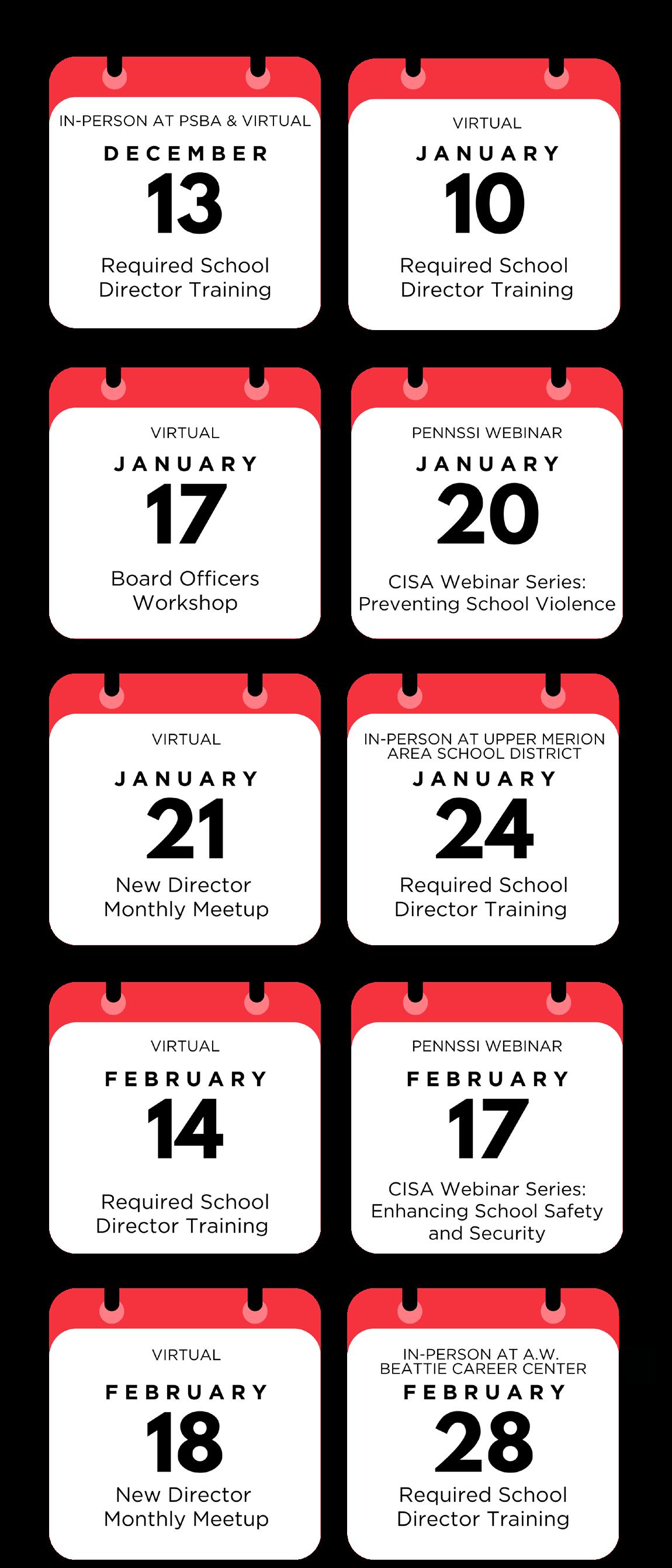 As your board welcomes newly elected school directors this fall, encourage them to attend New Director Monthly Meetups in the new year. Offered each month from January to June, directors can connect with colleagues, learn about the support PSBA provides to our members and ask questions of veteran school board directors during these hour-long virtual meetings designed to foster new board directors’ success. Learn more on myPSBA.