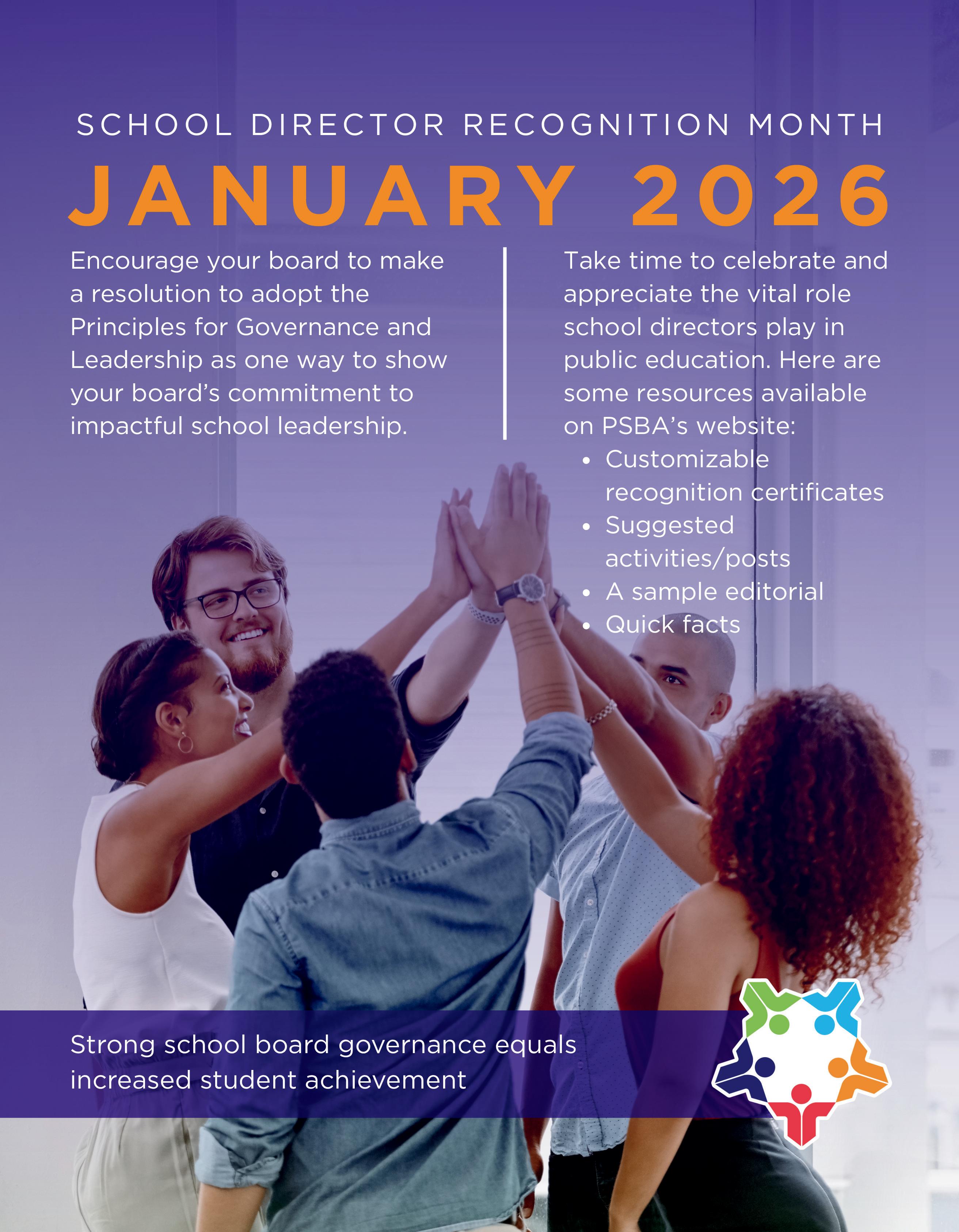 School directors dedicate their time and energy to strengthening public education year-round. January is designated as a time to honor them and highlight the valuable service they provide to their schools and communities. Find resources to help your schools celebrate on myPSBA, including sample press releases and posts, customizable certificates and more.