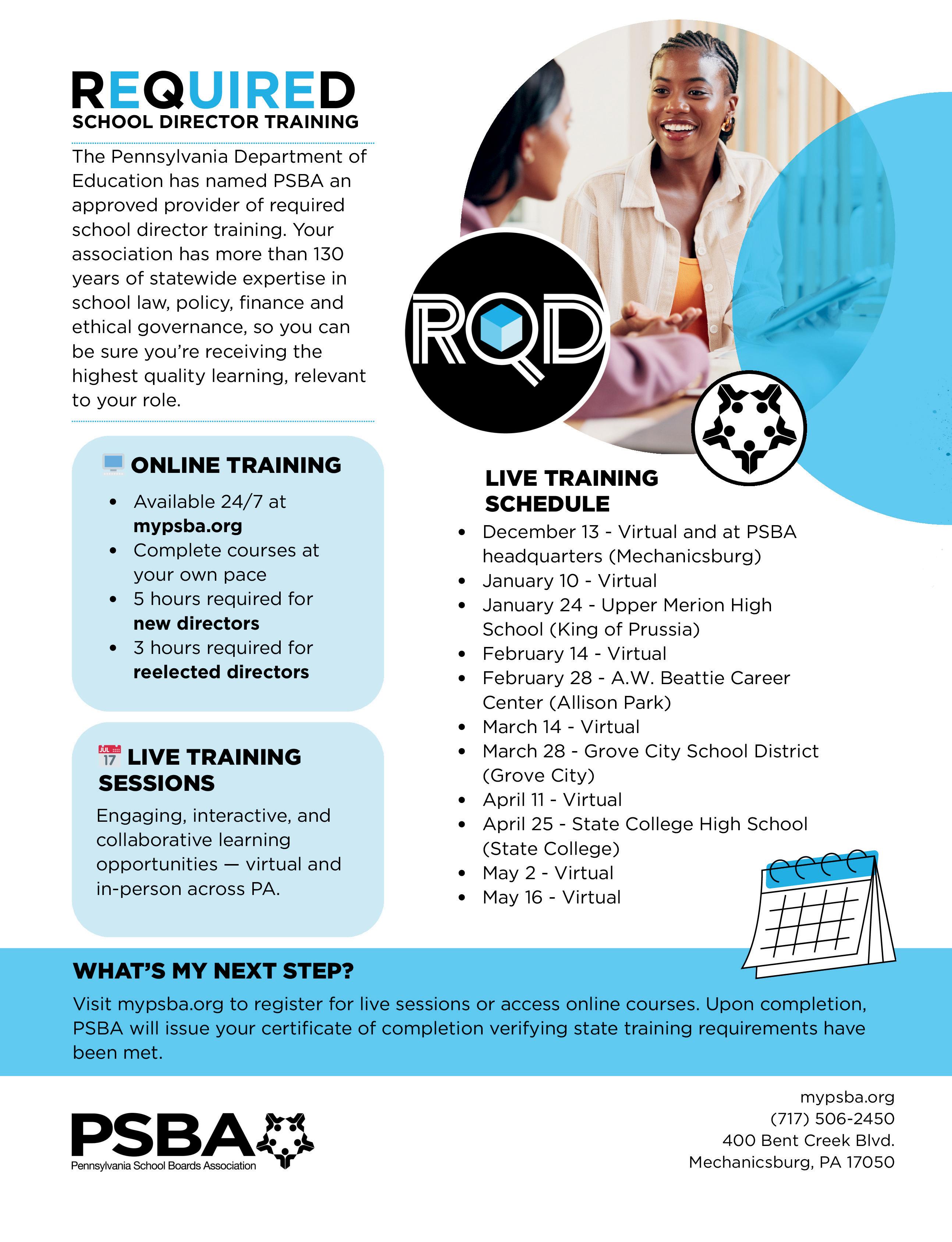According to the PA Public School Code, all newly elected/appointed school directors must complete five hours of training during their first term of office. Reelected/ appointed school directors must complete three hours of advanced training. PSBA is a PDE-approved provider of the required training and offers in-person, live virtual and online asynchronous options. Learn more at myPSBA.org/rqd.