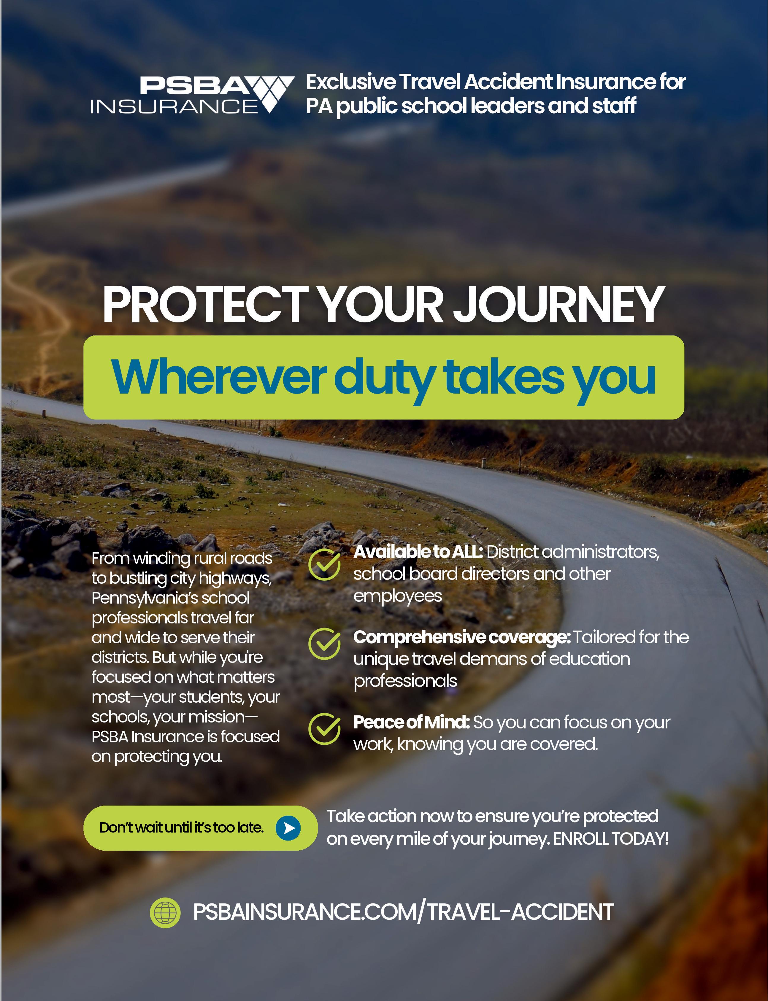 Encourage your outstanding students to apply now for the PSBA Trust's 2026 Student Leader Scholarships, which provide a one-time award of up to $2,500 or $5,000 to graduating seniors from PSBA member districts who have demonstrated ongoing leadership and meet the criteria for one of four available scholarship categories. Applications for the 2026 scholarships are due by March 13, 2026. Visit psbatrust.org to apply.