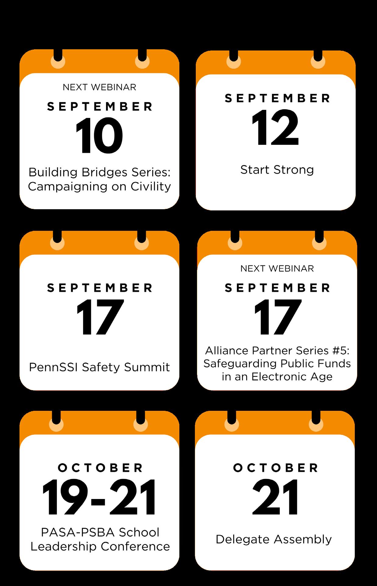 Leverage the expertise of our Partners to benefit your schools through the Alliance Partner Webinar Series. Explore the latest ideas, data and options available to inform your board’s strategy. Each webinar will be held from 12:00 to 1:00 p.m. on these remaining dates: September 17 and November 19. Also, explore the role of productive dialogue and civil discourse in fostering stronger schools during the Building Bridges Webinar Series. Outside experts in collaboration with PSBA will provide you with the opportunity to enhance your leadership skills and build a more respectful, empathetic and engaged school community. The next session takes place September 10. Register on myPSBA for both of these complimentary series.
