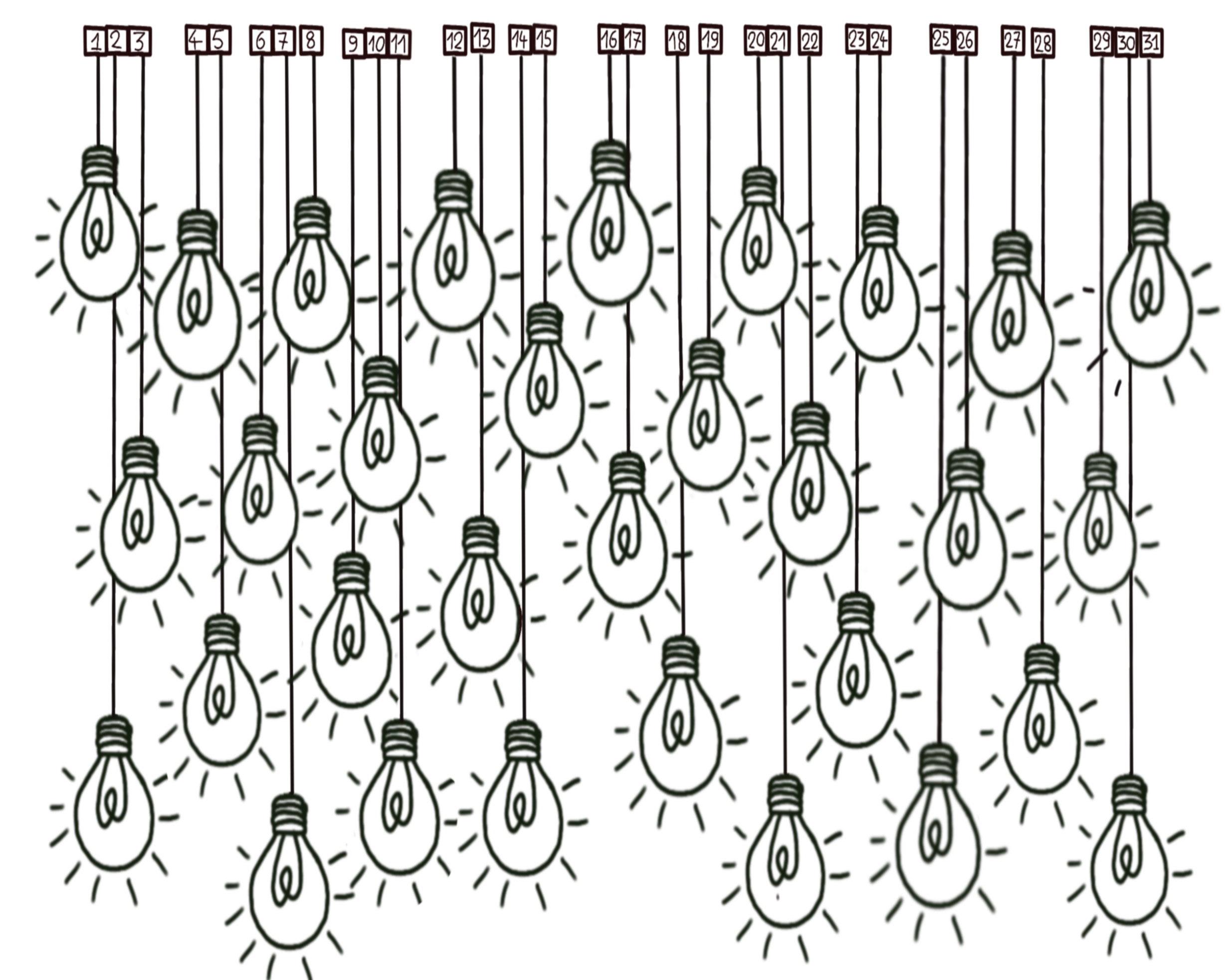 Omdat het in oktober al sneller donker is, kleuren we de lampjes. Elk lampje is een dag. Elke emotie of gevoel heeft een kleurtje. Elke dag kleur je een lampje in, in de kleur hoe jij je voelde die dag.
