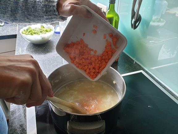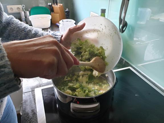 Schenk beetje bij beetje de bouillon bij de ajuin. Blijf goed roeren.