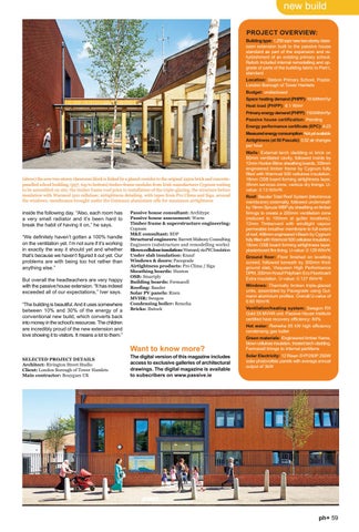 inside the following day. “Also, each room has a very small radiator and it’s been hard to break the habit of having it on,” he says. “We definitely haven’t gotten a 100% handle on the ventilation yet. I’m not sure if it’s working in exactly the way it should yet and whether that’s because we haven’t figured it out yet. Our problems are with being too hot rather than anything else.” But overall the headteachers are very happy with the passive house extension. “It has indeed exceeded all of our expectations,” Iver says. “The building is beautiful. And it uses somewhere between 10% and 30% of the energy of a conventional new build, which converts back into money in the school’s resources. The children are incredibly proud of the new extension and love showing it to visitors. It means a lot to them.”