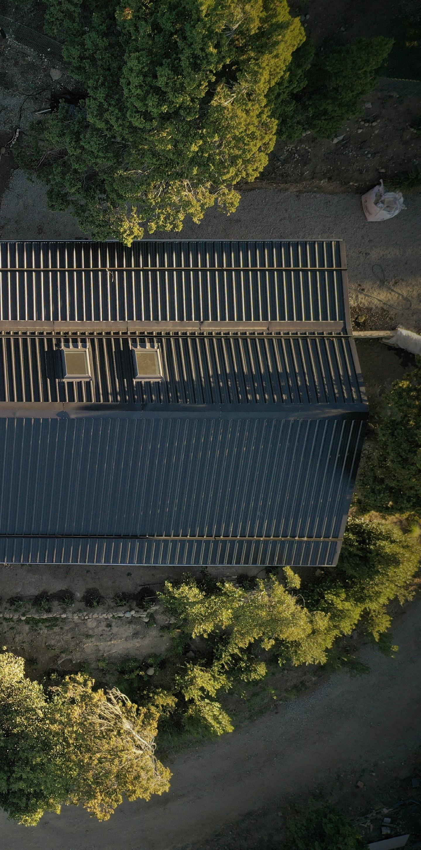 Using corrugated metal, local cladding materials, and a pitched locally sourced timber roof to integrate the house into the landscape and climate. The cladding was chosen to create a lower visual impact from the lake and surrounding terrain. Fire risk is significant in the area, and materials were assessed to find a cost-efficient balance.