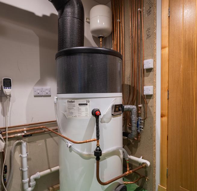 The primary heating system consists of a condensing combi boiler feeding radiators on the first floor and providing underfloor heating on the ground floor optimised with smart heating controls. Heat pumps are difficult to access in this part of the world, and fossil fuels remain the dominant heating source, making the combi boiler the most carbon-effective solution.
