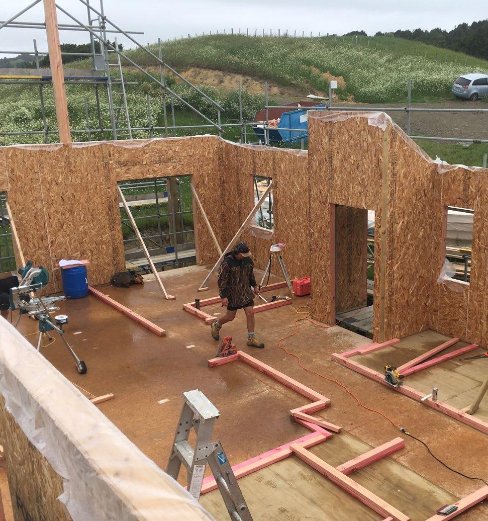 The project came about as a result of our kids getting sick in our standard, too-cold-or-too-hot, mouldy New Zealand house, and my wife Sarah and I being unable to watch any longer. We decided to put our (minimal) money where our mouths were, to prove that high per forming, healthy homes can be achieved at standard budgets, while still being beautiful places to live. Cost was the key constraint. As first-time buyers with a small deposit, prioritising and compromising were essential. An envelope-first strategy was decided on to prioritise performance: site specific insulation, good air tightness, great windows and doors, no thermal bridg ing. We would develop the interior as a family once we moved in. What resulted is an unpretentious, passive house certified home that blends into its rural context, while keeping its inhabitants warm, dry and healthy year-round.Theinitial design was a single-storey home that could be extended into the roof space later. But to get funding from the bank, however, we ended up having to build the first-floor bedroom and bathroom to increase the value of the house to match the build cost, but without running up the construction cost – a challenging exercise and negotiation with the contractor!