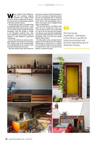 hen architect Clare Williamson and her structural engineer husband Oscar Baldry moved into their tiny low energy house in Shrewsbury back in 2015, it seemed large compared to what they had been used to. The pair had just spent 18 months living in a panelled builder’s van in the UK — nine months exploring the whole country, and the rest of the time parked outside the derelict newsagent’s they had bought to retrofit in the Shropshire medieval town. After such confinement, the 42 square metres of ‘Beehive’, as they dubbed it, represented untold luxury. It is true the decision to purchase such a small property came partly out of necessity. They wanted to get on the housing ladder and could afford little more. However, it also accorded with their personal values. They had watched many videos about the