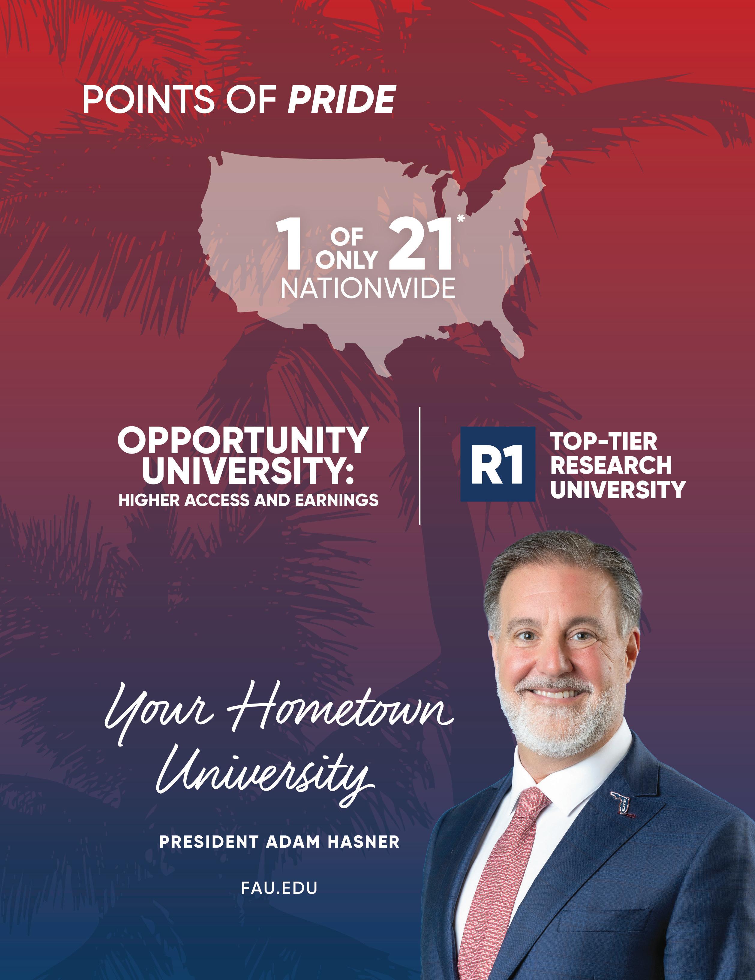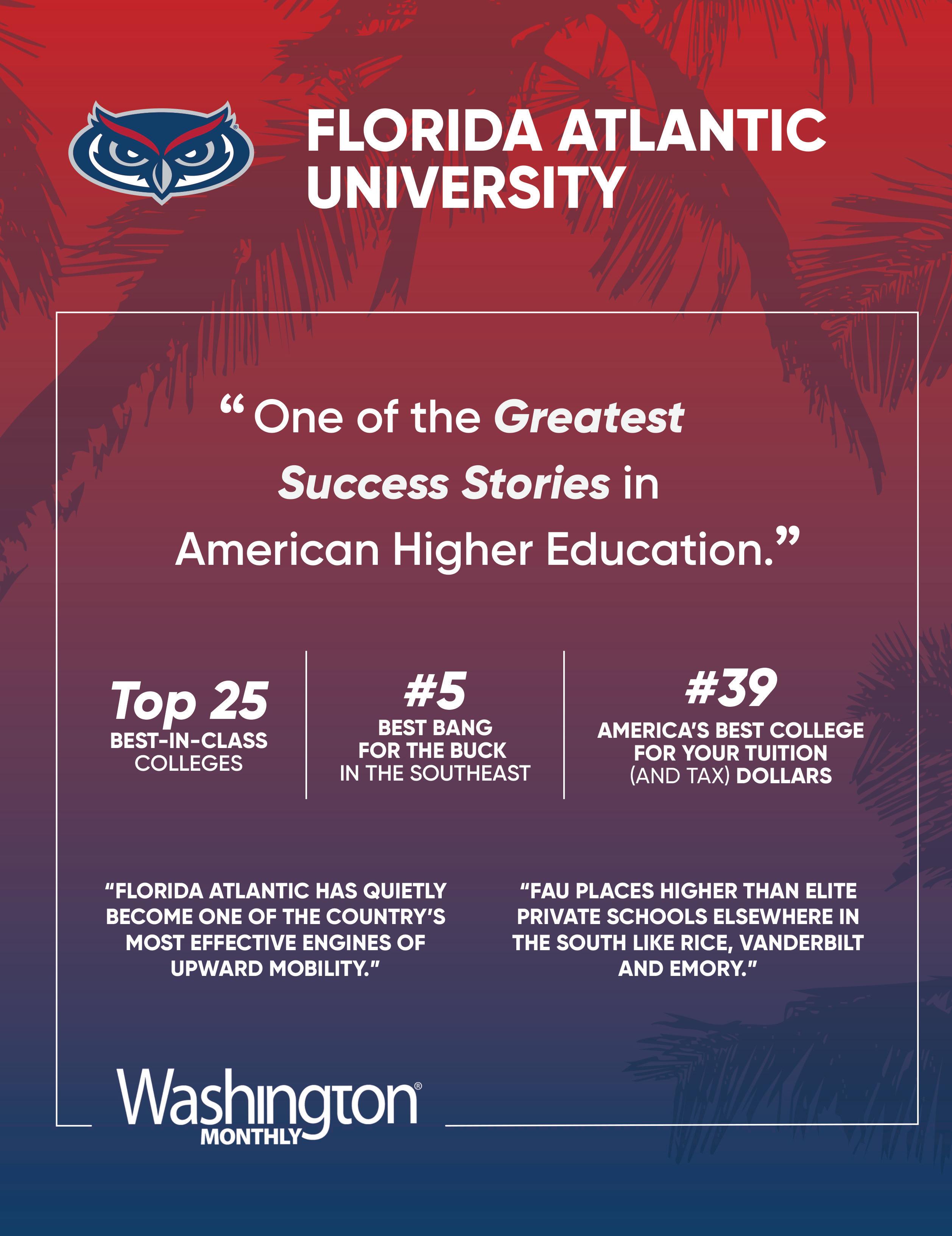 FLORIDA ATLANTIC UNIVERSITY was ranked by Washington Monthly at No. 39 on the “America’s Best Colleges for Your Tuition (and Tax) Dollars” for the nation’s best public and private universities.