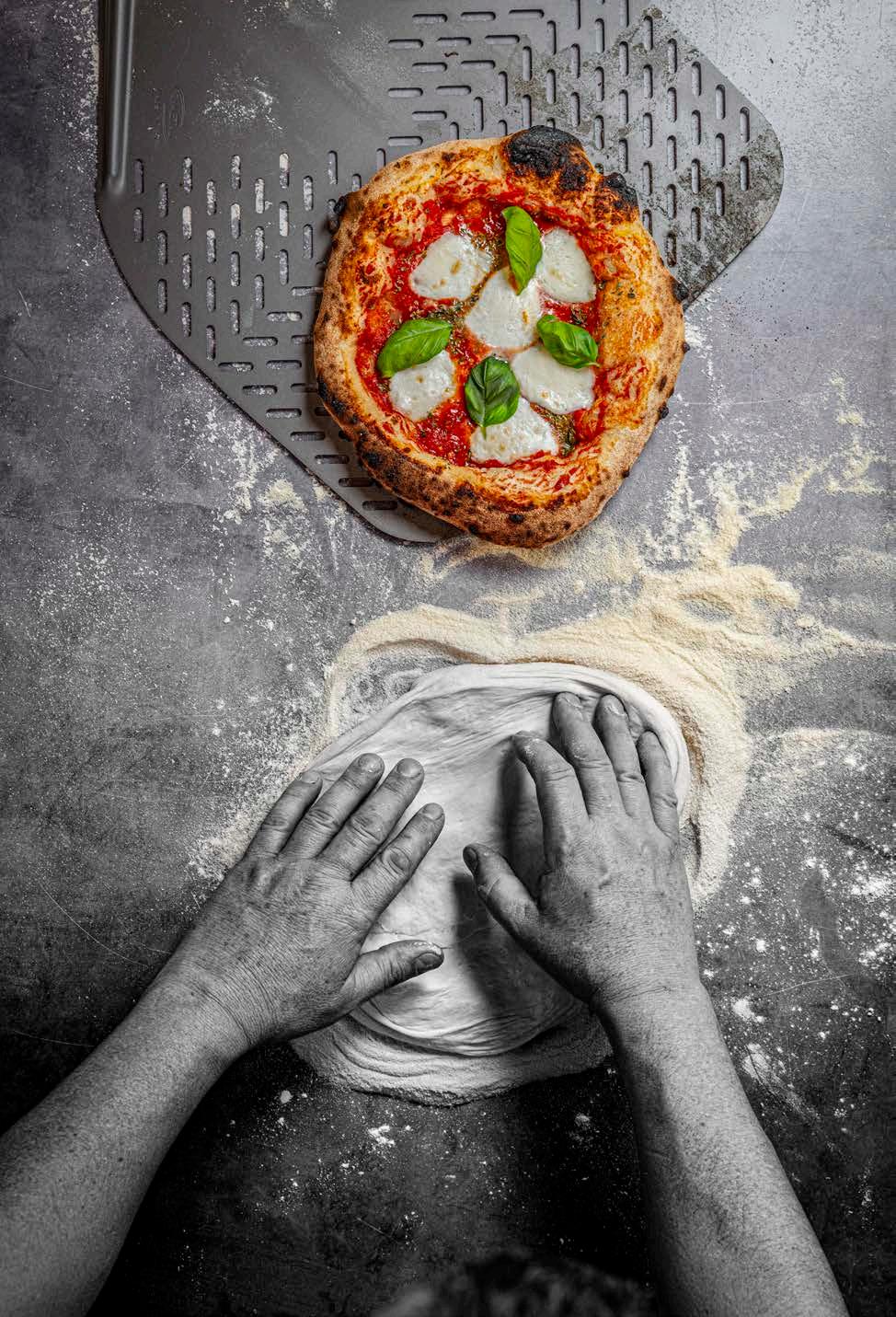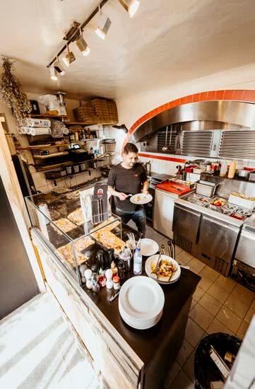 lauf des gesamten Mittags nicht ab. Alles scheint wie eine große Familie, orchestriert von Michele, der zwischen Bestellannahme, Pfannen schwenken, Pizza formen, Spülen und Abkassieren auch noch Zeit findet, auf jeden Gast einzeln einzugehen. „Für deinen Mann einmal wie immer?“ „Ist Tom wieder gesund?“ „Wie war es heute in der Schule?“