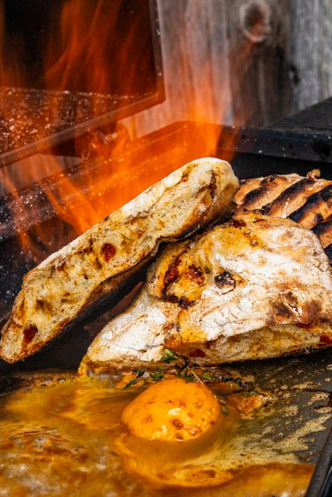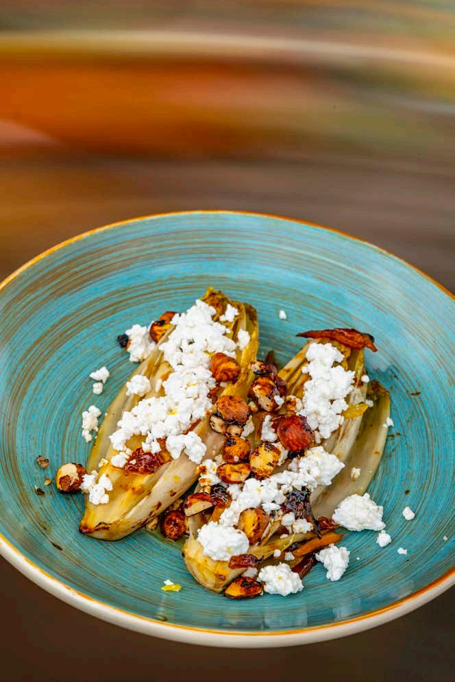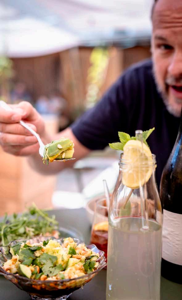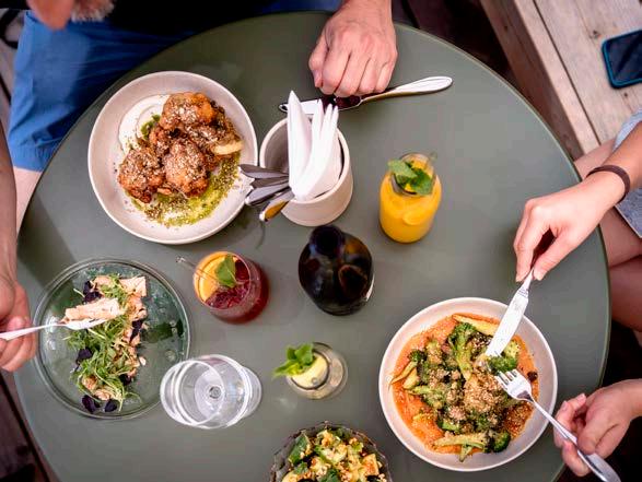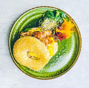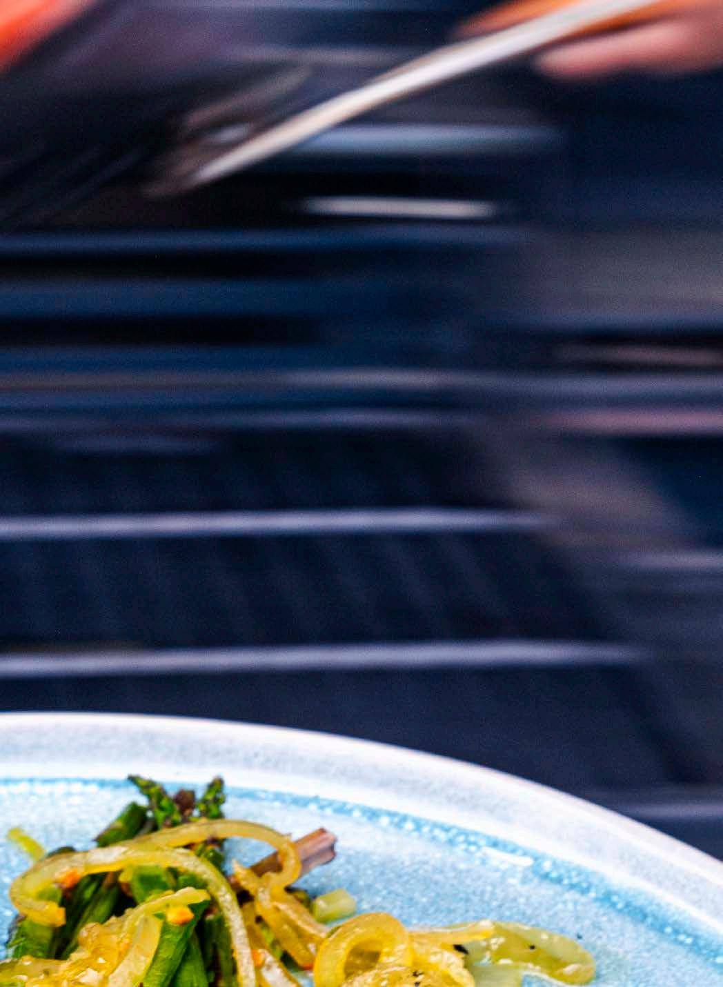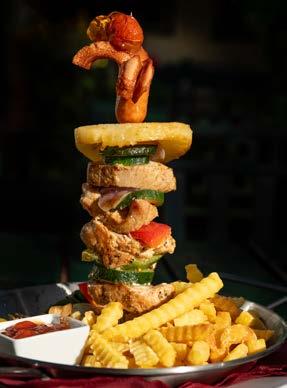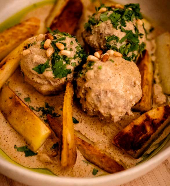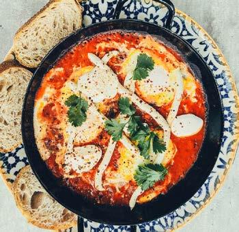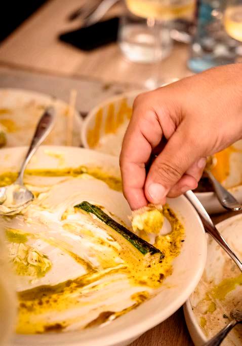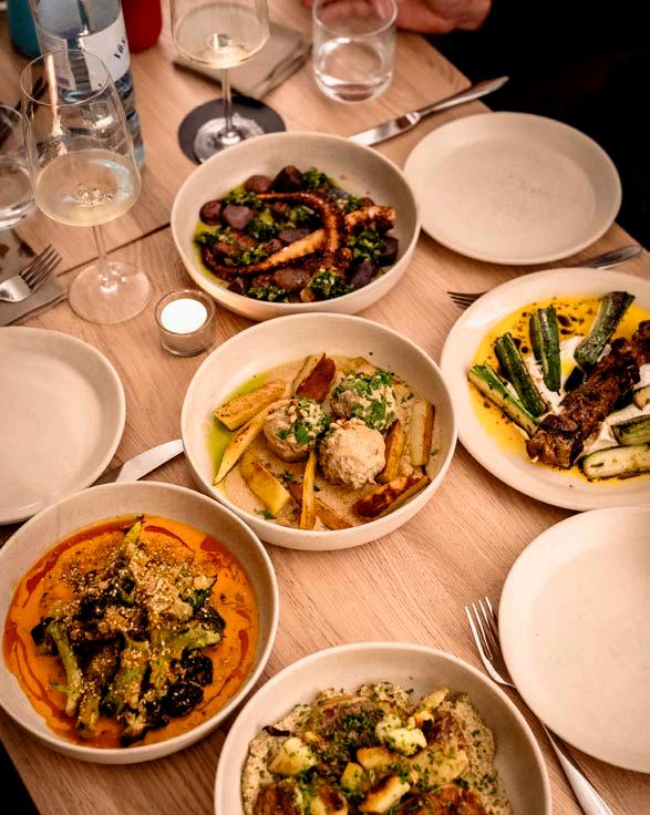 mit Kartoffelsticks und Sesam-Joghurt und die Lamm-Kebabs mit Labneh, gegrillter Zucchini und Safran-Butter stehen für türkisches Wohlfühlessen erster Klasse. Der gegrillte Oktopus mit lila Kartoffelgnocchi, Petersilie und Olivenpesto marschiert wiederum in die mediterrane Richtung. Indes wandert der gegrillte Brokkoli mit SrirachaButter, Ingwer und Forellen-Furikake nach Fernost, während es sich der gebackene Blumenkohl mit Tahini und Dukkah irgendwo im vorderen Orient gemütlich gemacht hat.