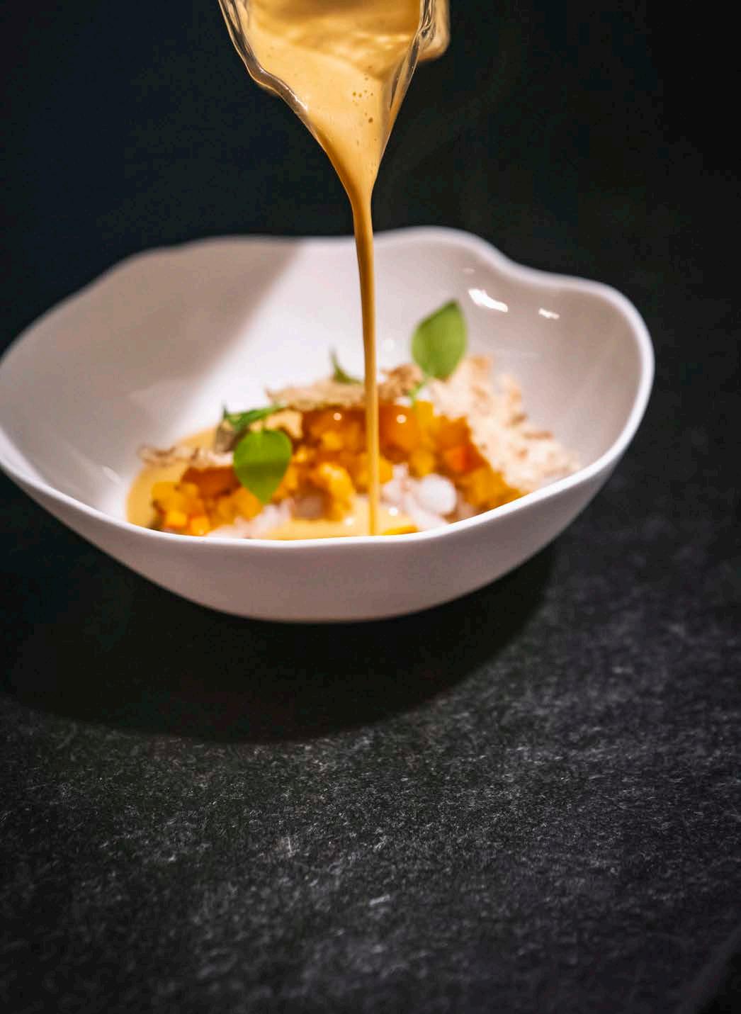 men wieder halbwegs zu resetten, wird dann ein kleines Quittensorbet eingestreut, das mit Darjeeling-Tee und SzechuanPfeffer die Geschmacksnerven kitzelt und Raum schafft für die darauf folgende, perfekt auf dem Yakitori-Grill vollendete Ente. Letztere flattert ebenfalls als Dreierlei auf den Teller: in Gestalt gebratener Scheiben mit roter Beete, als gezupfte Entenkeule, die es sich unter einem Heu-Beete Schaum gemütlich macht, sowie als krosse Praline. Das begleitende alkoholfreie Getränk namens Hoison NR Style besteht aus Radicchio, Pastinake, Balsamico und Himbeere. Wie gemacht zur Ente, markiert diese Kreation – so scheinbar selbstverständlich sie daherkommt – einen weiteren abendlichen Höhepunkt. Sommelier Nico besitzt eine gewisse Nerdigkeit, die es wahrscheinlich