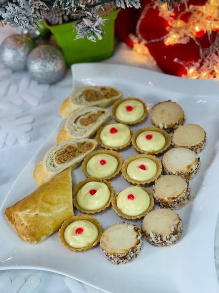 Incluye: -Un strudel relleno de pollo -Ocho tartas rellenas de crema -Seis mini chilenas con dulce de leche y almendras