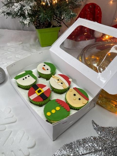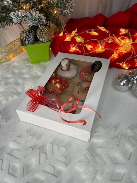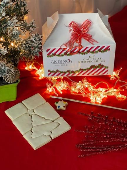 -Todas las piezas forradas en fondant para armar el rompecabezas -Galleta estrella con pinturas tipo acuarelas comestibles -pincel -Base de cartón dorada -Royal icing para pegar a base -Código QR para videos de instrucciones -Código QR para escanear playlist navideña -Carta para escribirle a Santa