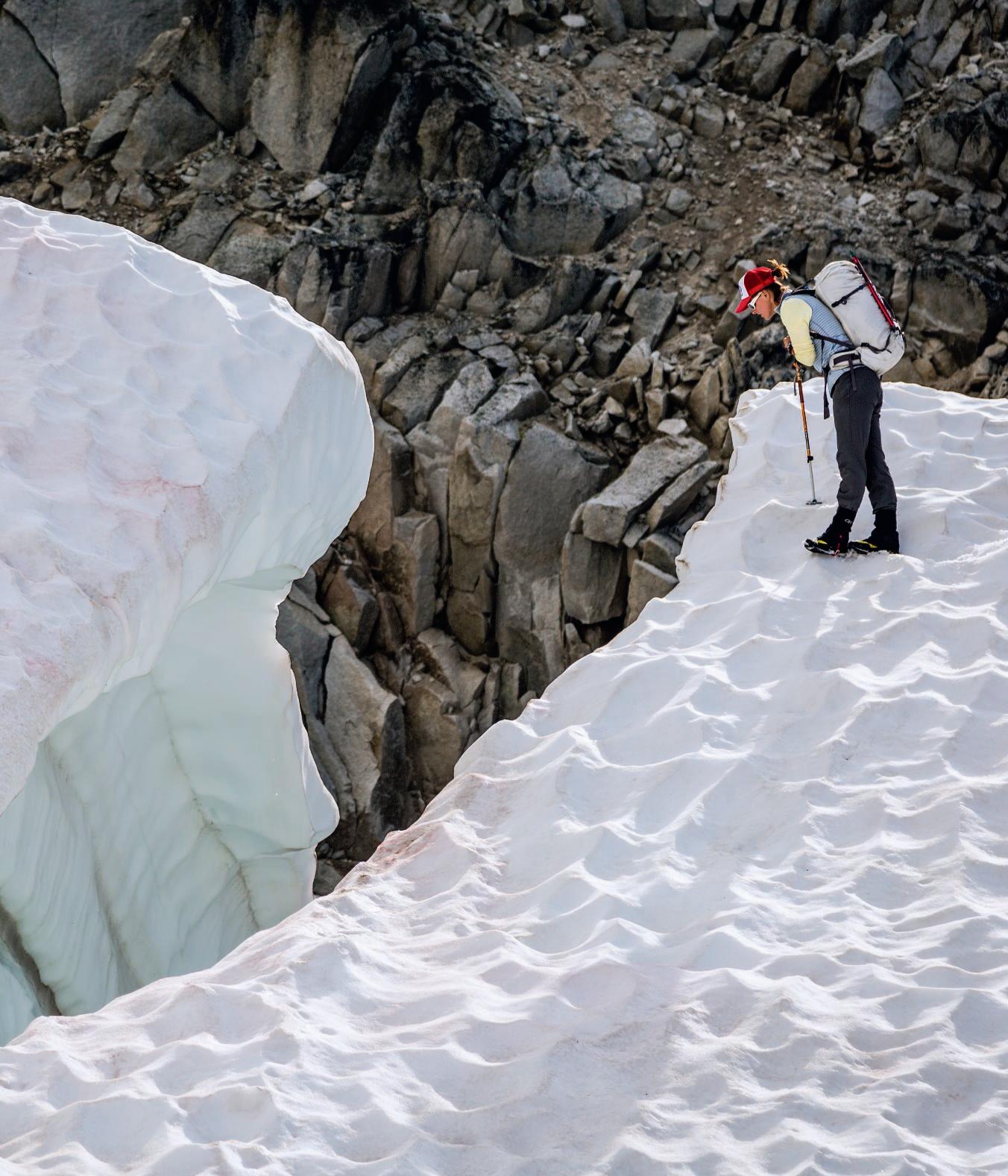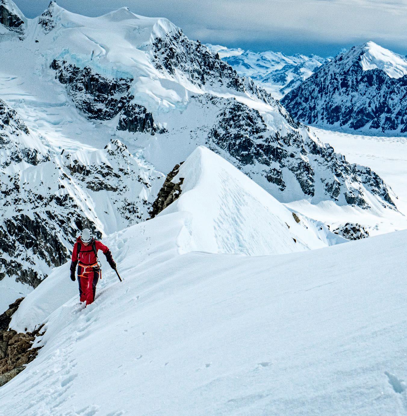 「『すばやく身軽に動く機能』が悪天候対応型プロテクションと ひとつになったのははじめてのことで、真に大きな課題に取り組む クライマーのために作られたものでした」と回想するのは、アンバ サダーからアルパイン製品ラインのマネージャーに転身したケイト・
