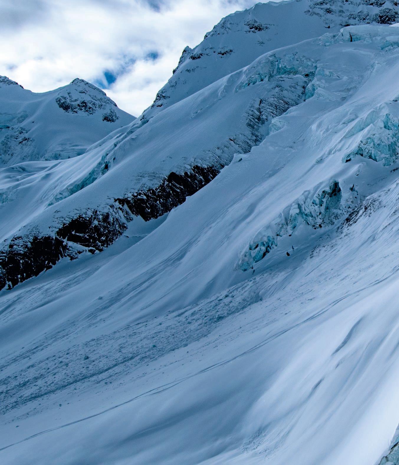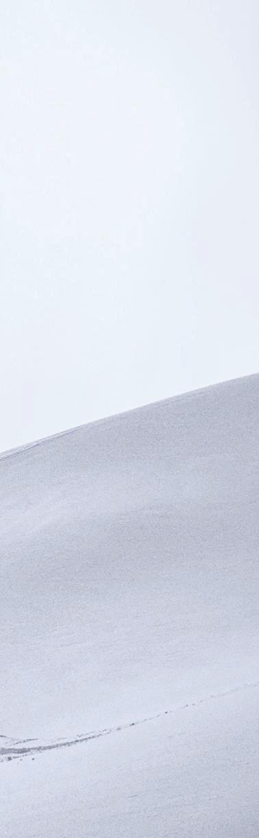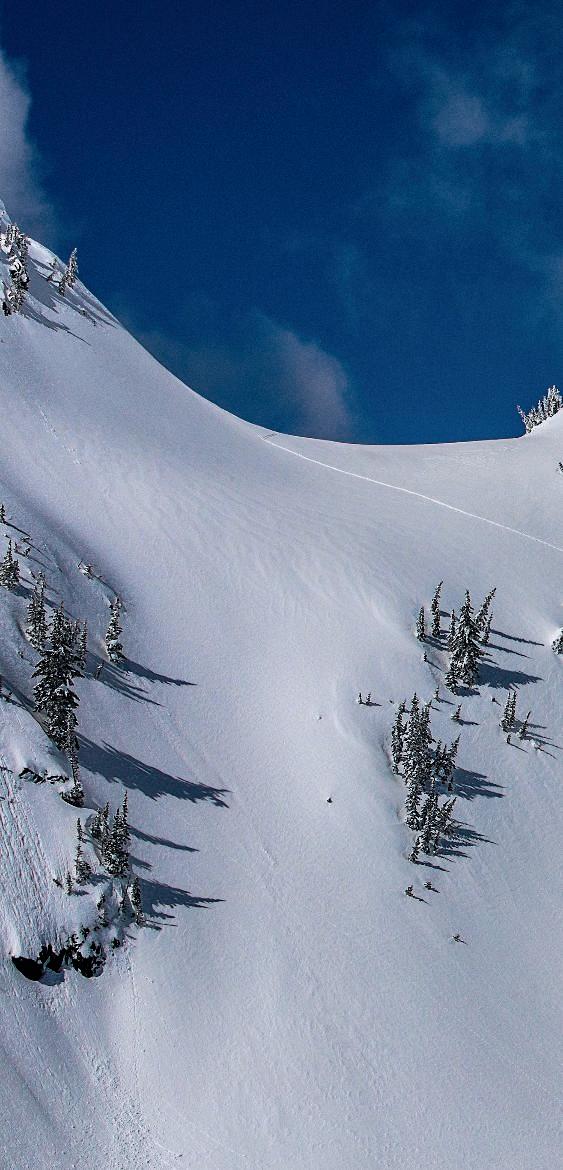 私はこの10年間、シール登高で先頭を引いたり、人の後ろ につづいたりしながら、自分のあとをたどる人に思いを寄せる ことに、数えきれないほどの時間を費やしてきました。それぞ れのトレースは、目印と同じように、それを描いた人の動機や 山に対する姿勢が秘められています。つねに自分のルート取り が適切かどうか自信がなくて自問しつづけるような、自分を意 識しすぎる人もいれば、正確さや効率を計算して登る人、ある いは効率などお構いなしに頂上への最短ルートを狙う人もいま す。そして、ただ登るのではなく、地形とのダンスを楽しむよう に自己を探求する実存主義的なアプローチを取る人もいます。